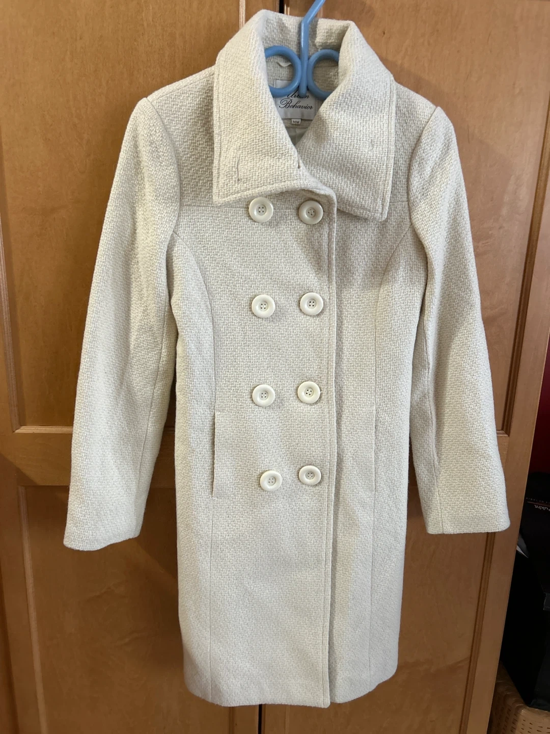 Here's a lovely beige women's coat! It features a double-breasted button design and a tie at the back for a flattering fit. It's in great condition and perfect for adding a touch of elegance to your wardrobe