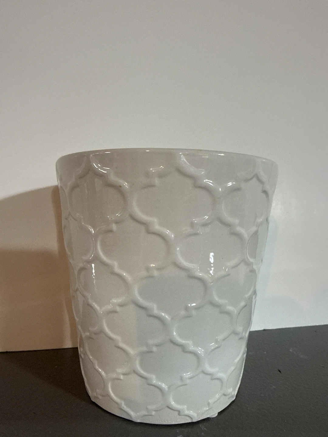 This white ceramic planter pot features a stylish embossed geometric pattern. It's a lovely container for your plants. Ceramic material.