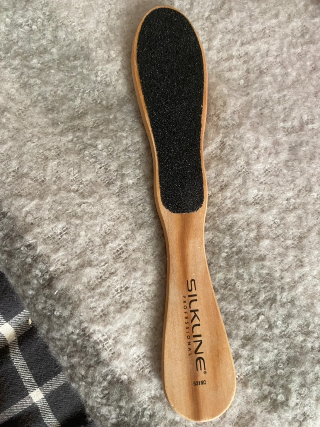 I'm selling a Silklíne Professional foot file. It's in great shape and ready to help you smooth your feet! It features a wooden handle for comfortable grip and a durable abrasive surface.