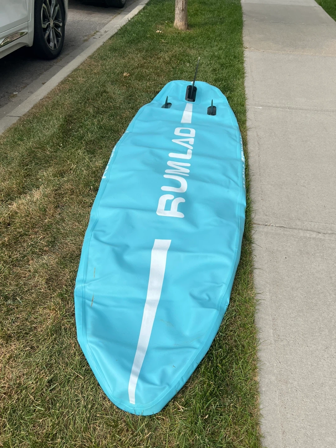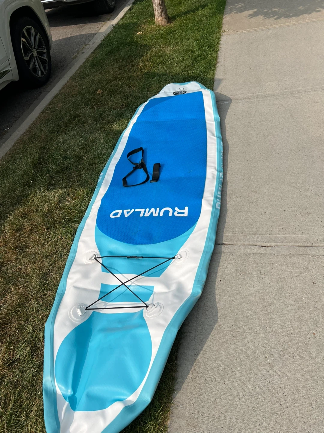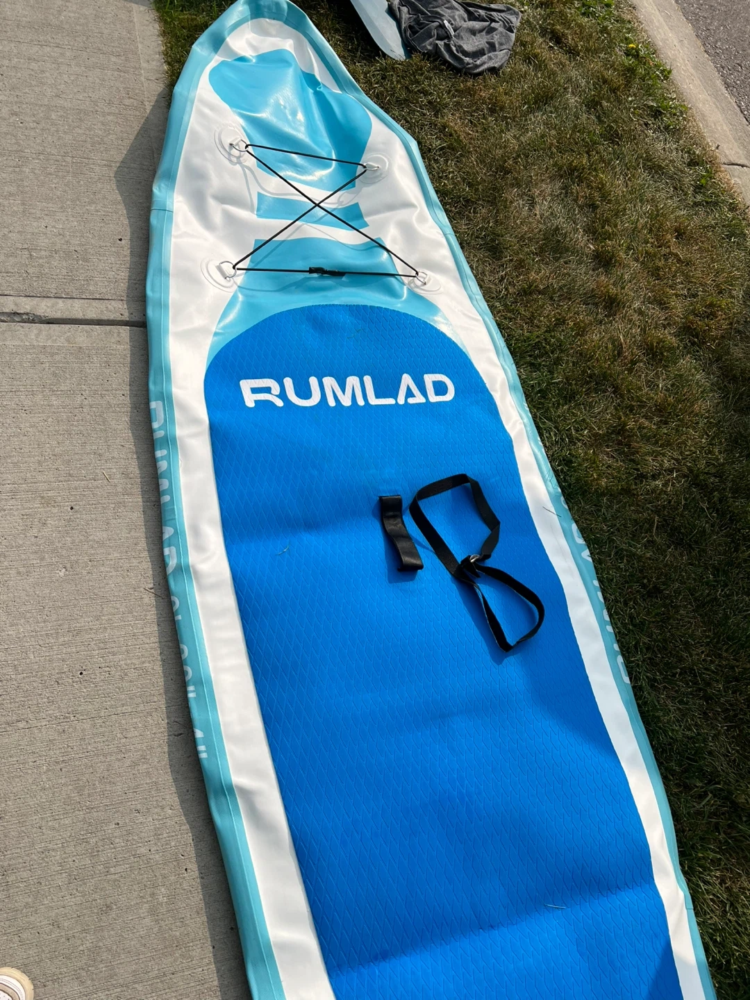 Selling a Rumlād inflatable stand-up paddle board. It comes with all the accessories you need to get out on the water, including a pump, paddle, and fin. Great for enjoying the summer weather! Used 1 time only. 10x30x4