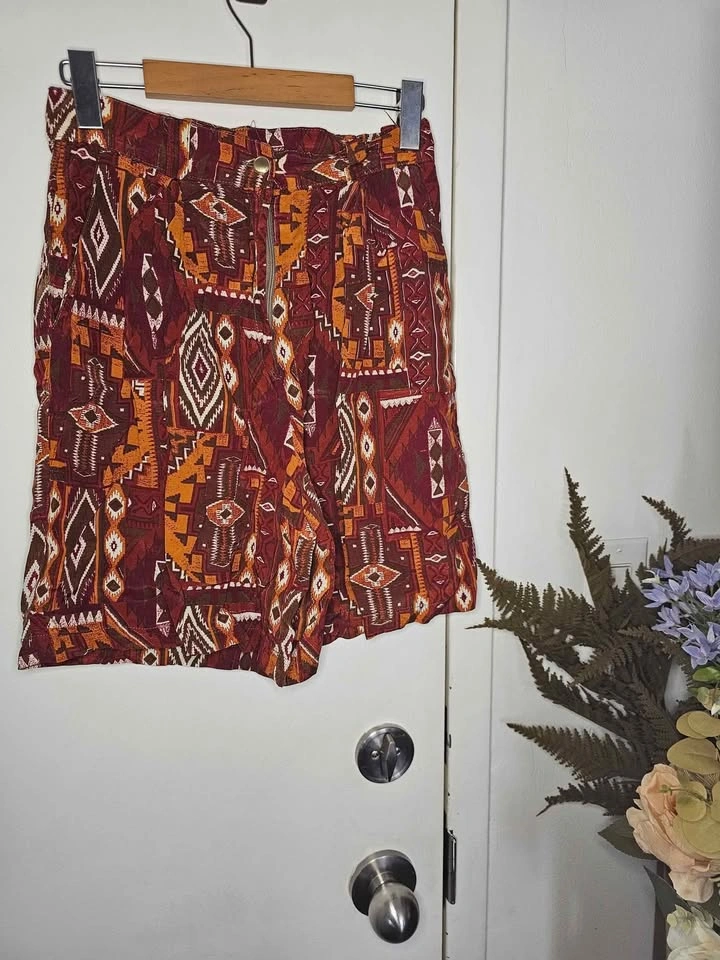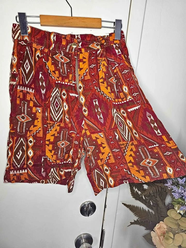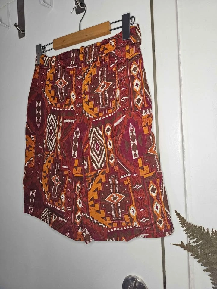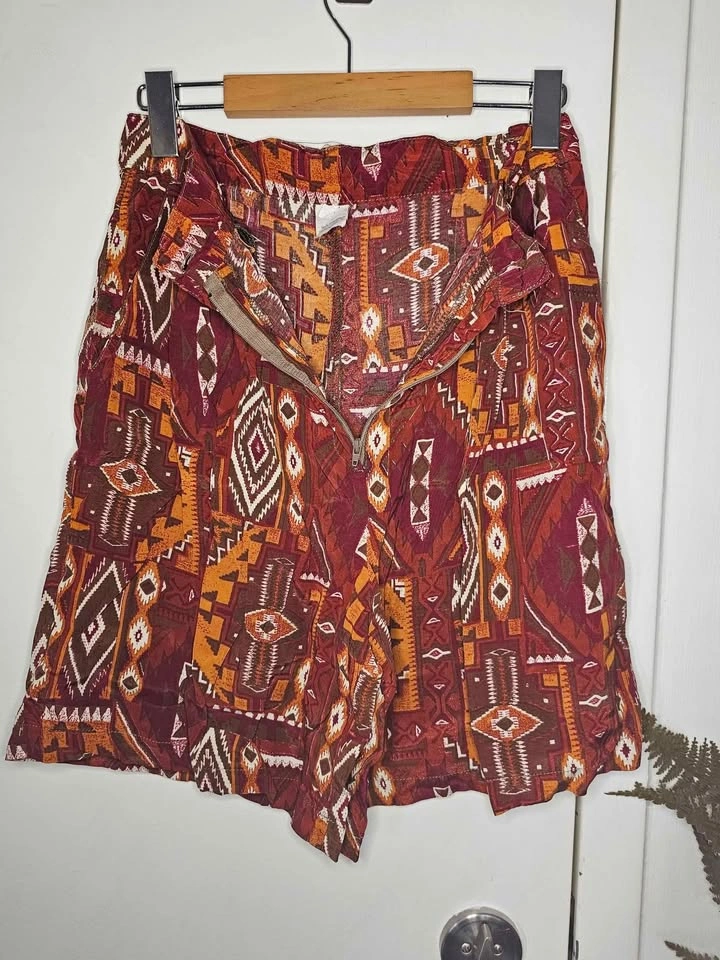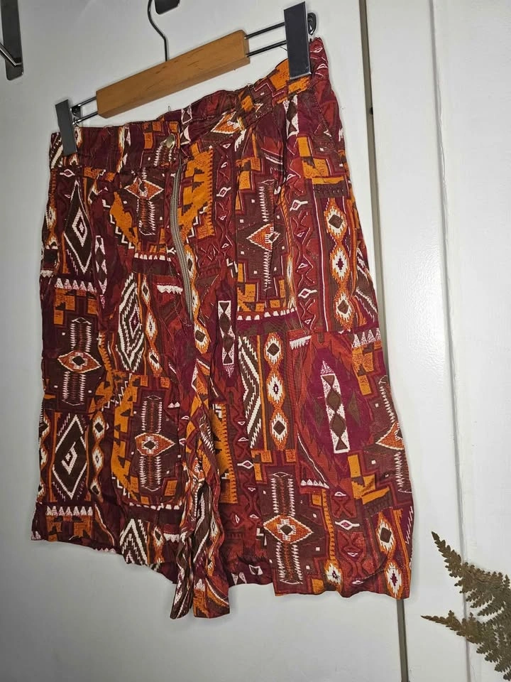 True vintage shorts in a burgundy, brown, orange and white Southwestern pattern print. High waisted fit with side pockets and made of a lightweight and breathable viscose material, perfect for the summer heat! Shorts have a zipper fly closure.