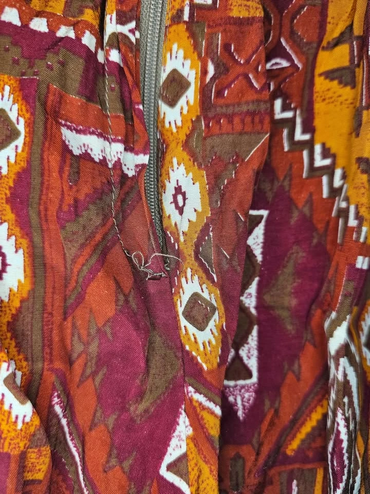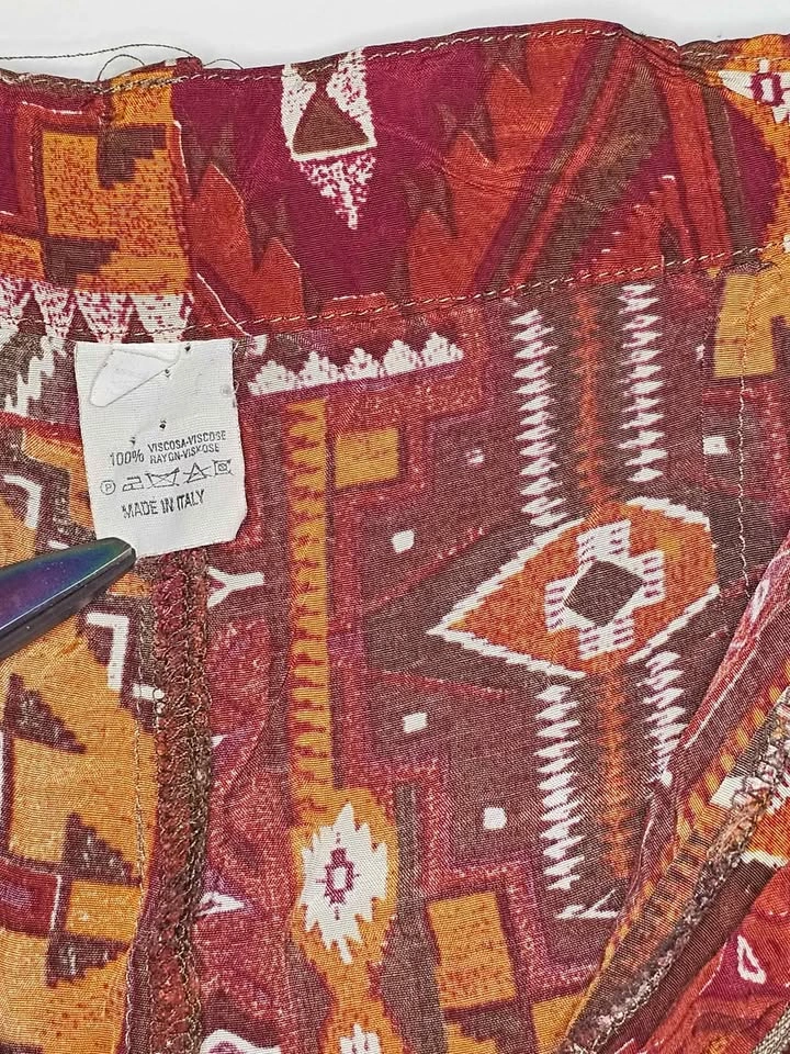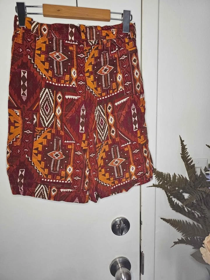 True vintage shorts in a burgundy, brown, orange and white Southwestern pattern print. High waisted fit with side pockets and made of a lightweight and breathable viscose material, perfect for the summer heat! Shorts have a zipper fly closure.