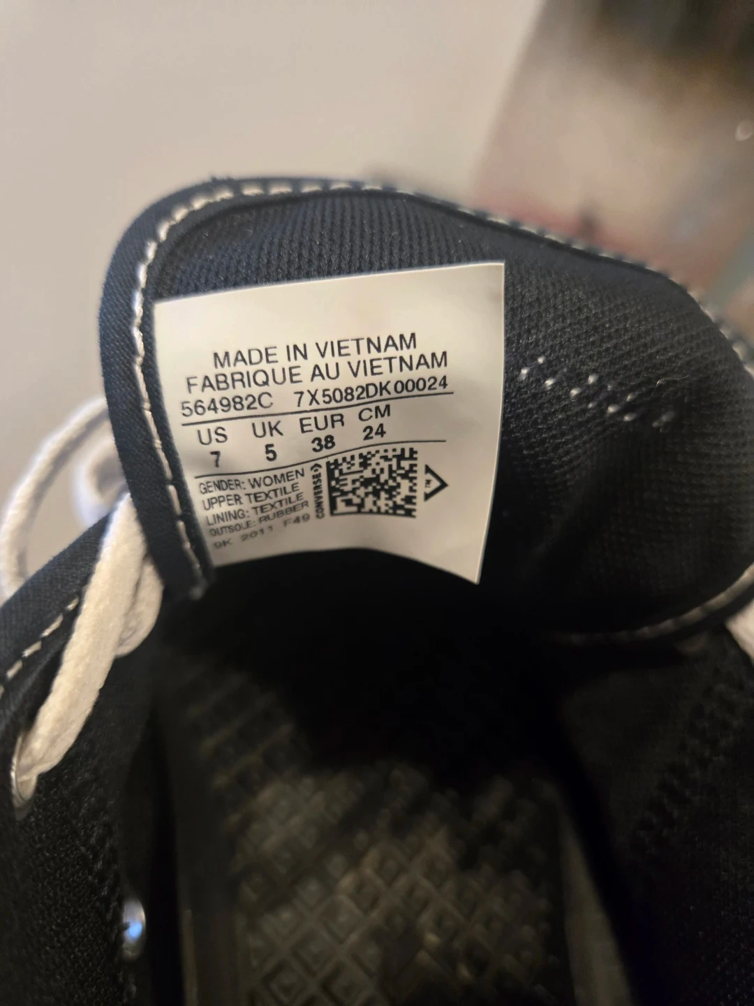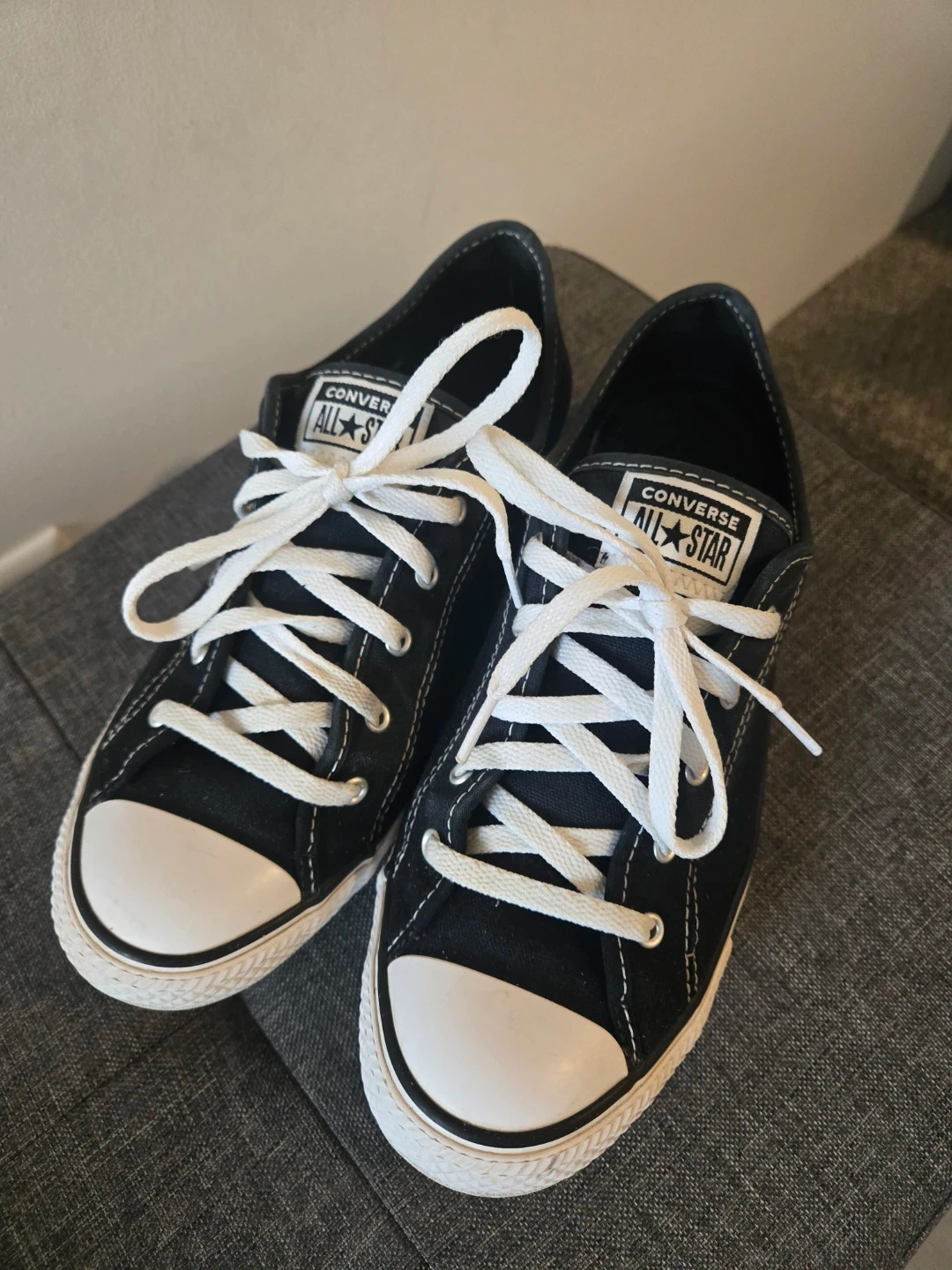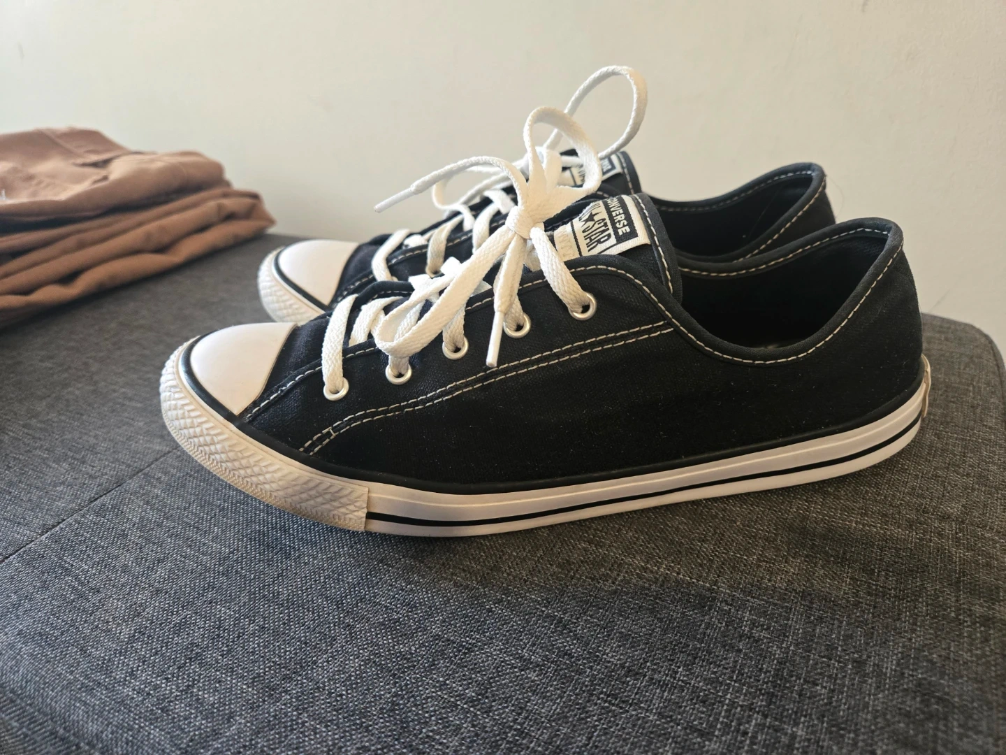 Classic Converse All Star low top sneakers in black canvas. Women's US size 7. These shoes feature a rubber toe cap and a durable rubber sole. Excellent condition.