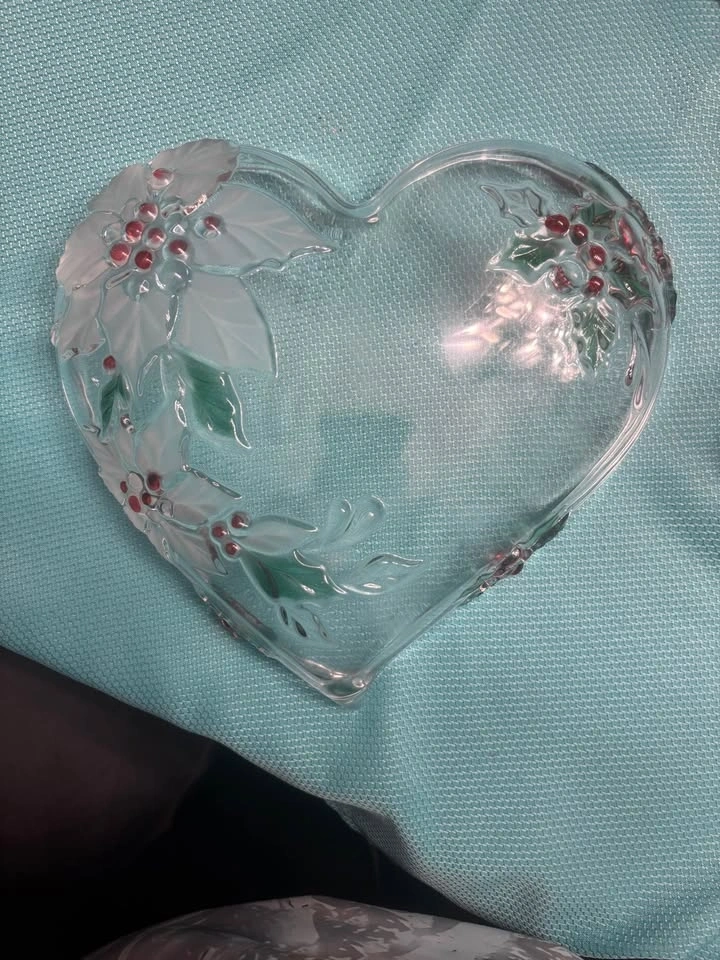 Beautiful Mikasa Holiday Bloom Poinsettia Crystal Heart Bowl. Good condition, with some barely visible scratches shown in the last picture. Pick up in Keswick.