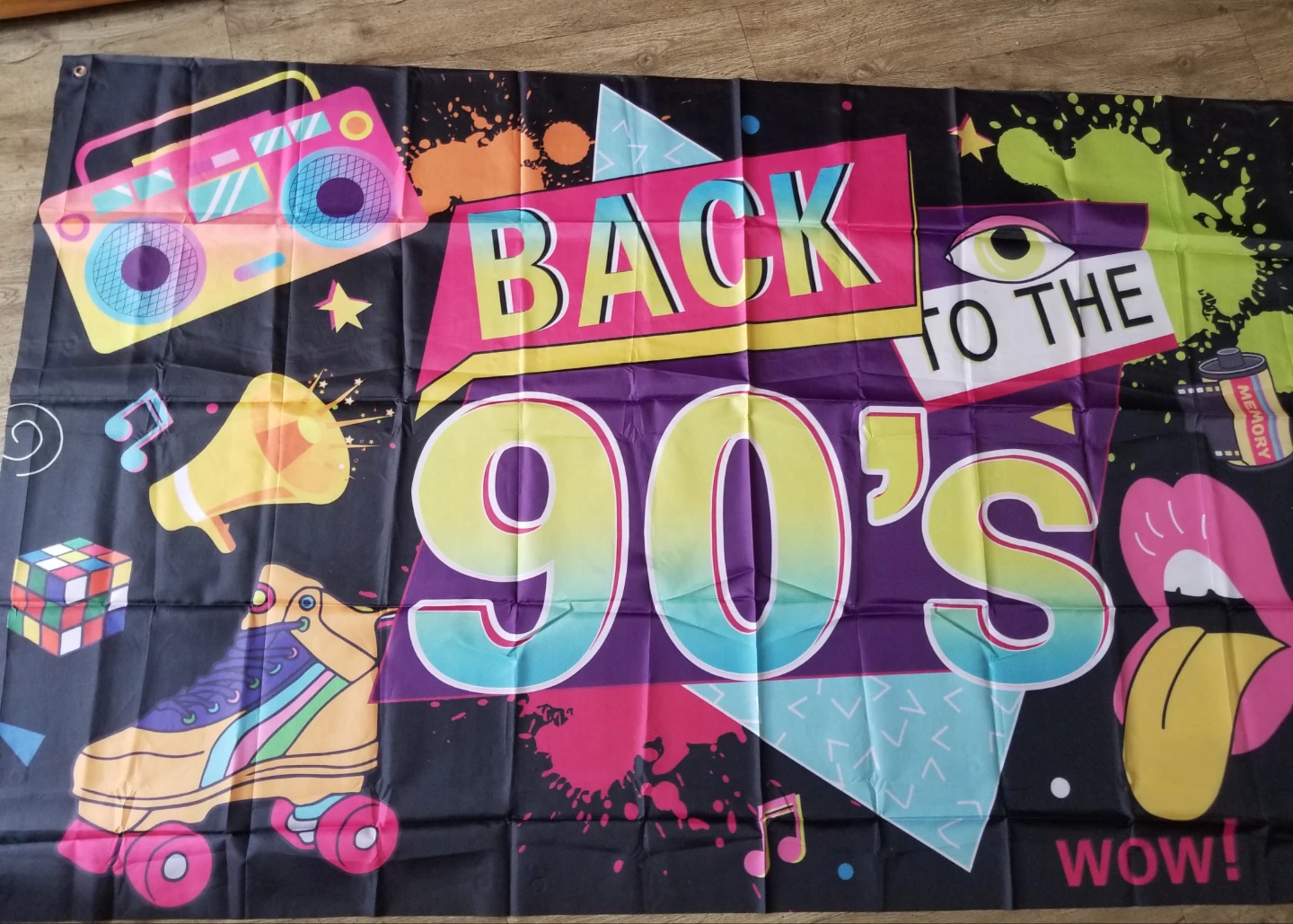 Spice up your party with this fun banner! This 'Back to the 90's' banner is perfect for adding a retro touch to any event. It features vibrant colours and iconic 90s imagery like roller skates, boomboxes and Rubik's cubes Approximately 42x74