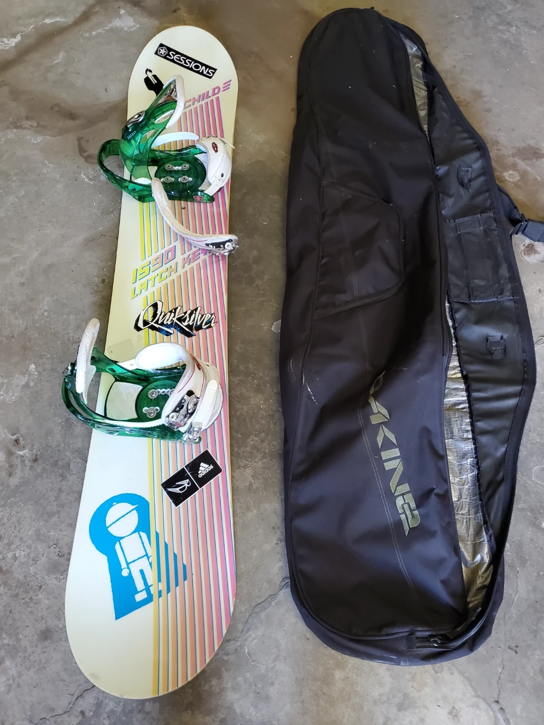 This is a Sessions Stepchild snowboard with Burton cutom Latchkey bindings. It's 159cm long and comes with a Dakine snowboard bag. Great for hitting the slopes!