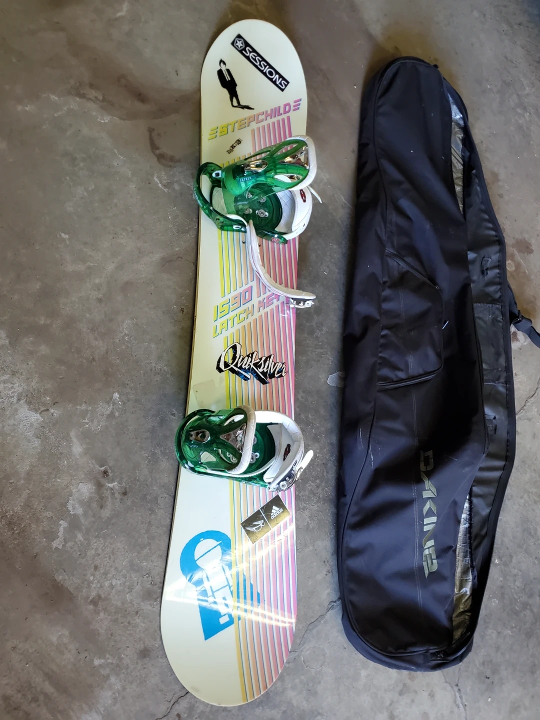 This is a Sessions Stepchild snowboard with Burton cutom Latchkey bindings. It's 159cm long and comes with a Dakine snowboard bag. Great for hitting the slopes!