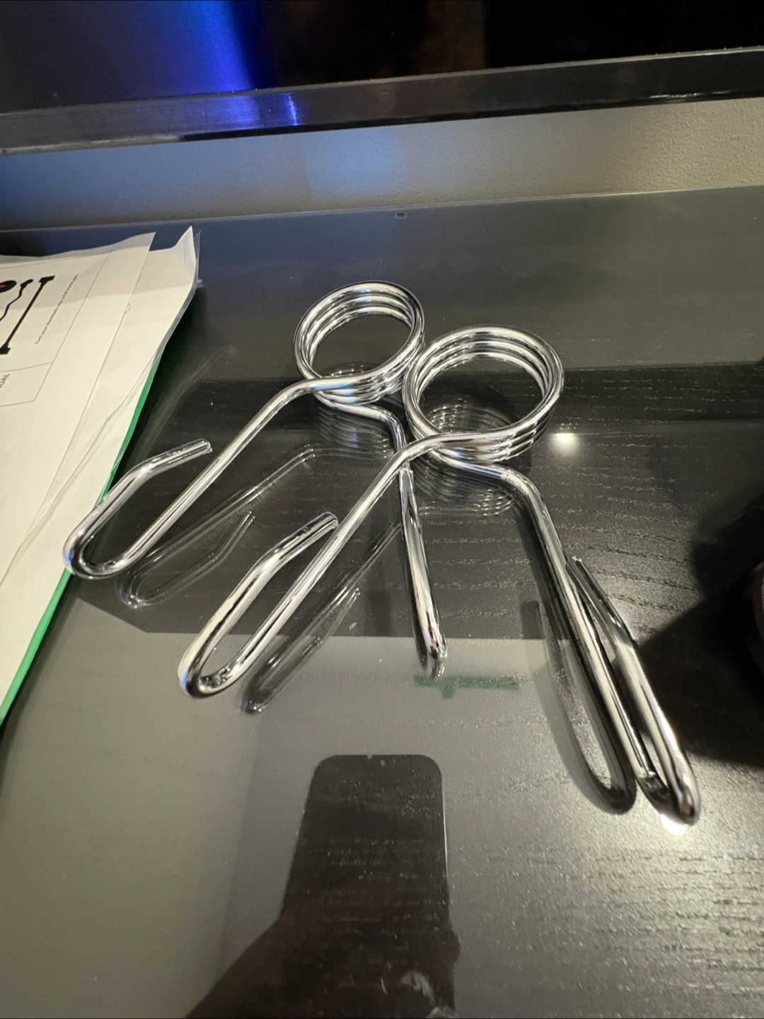 Up for grabs, a black barbell alongside a pair of metal barbell collars. It would be a great addition to a home gym, providing a great source of physical activity. Also is brand new and has not been used!!
