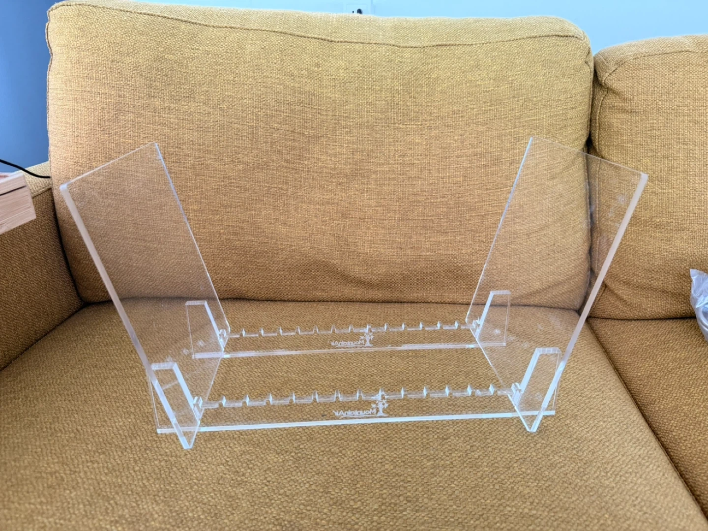 This clear acrylic vinyl stand is perfect for displaying your music collection! It's made of durable acrylic material. This stand is great for a desk or countertop!
