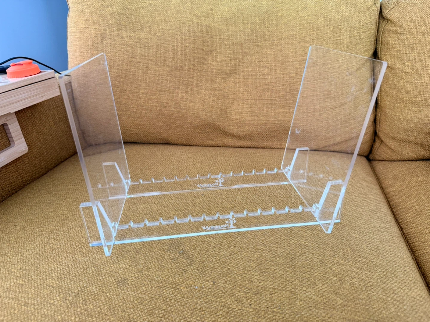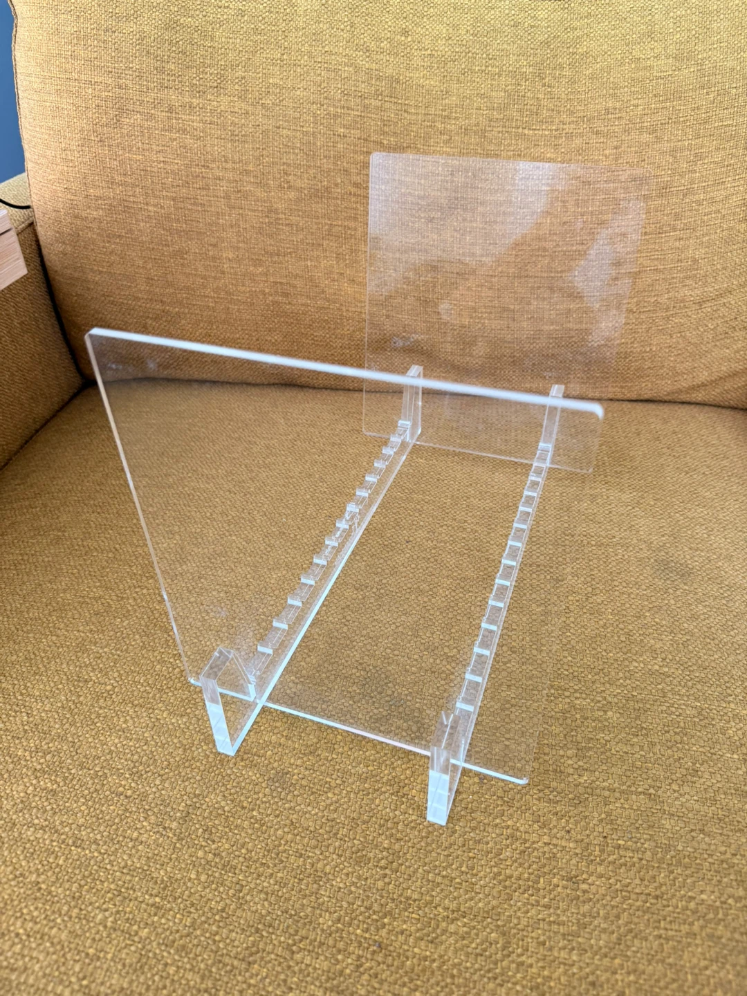 This clear acrylic vinyl stand is perfect for displaying your music collection! It's made of durable acrylic material. This stand is great for a desk or countertop!