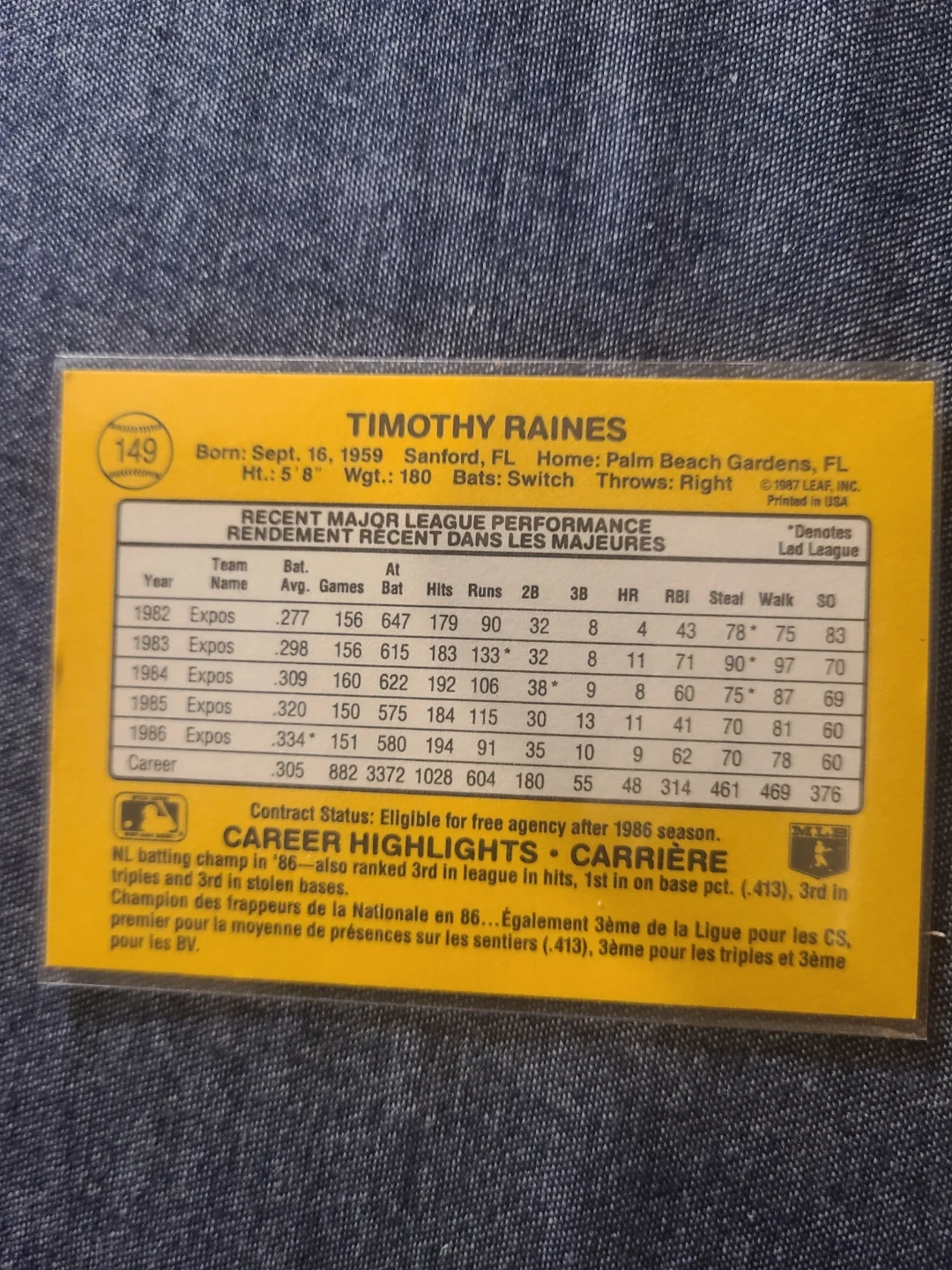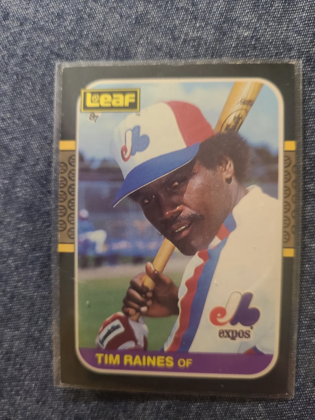 Vintage 1987 Leaf baseball card featuring Tim Raines of the Montreal Expos. Card shows stats and career highlights on the back. Printed in USA.