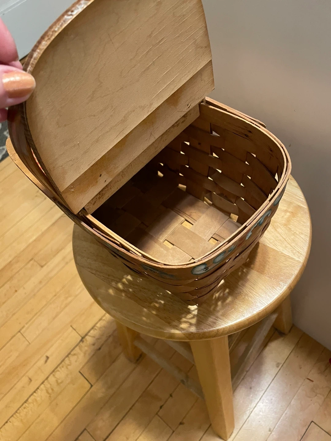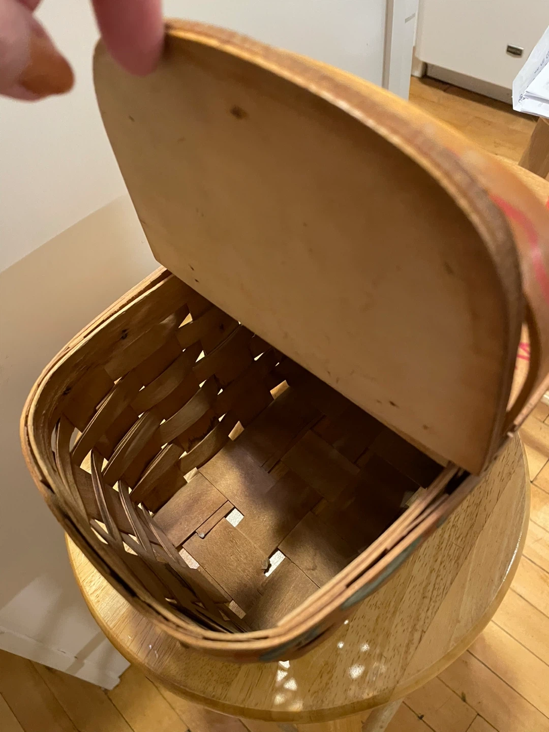 A Dorothy Toto Wooden Basket with double sided Lid.