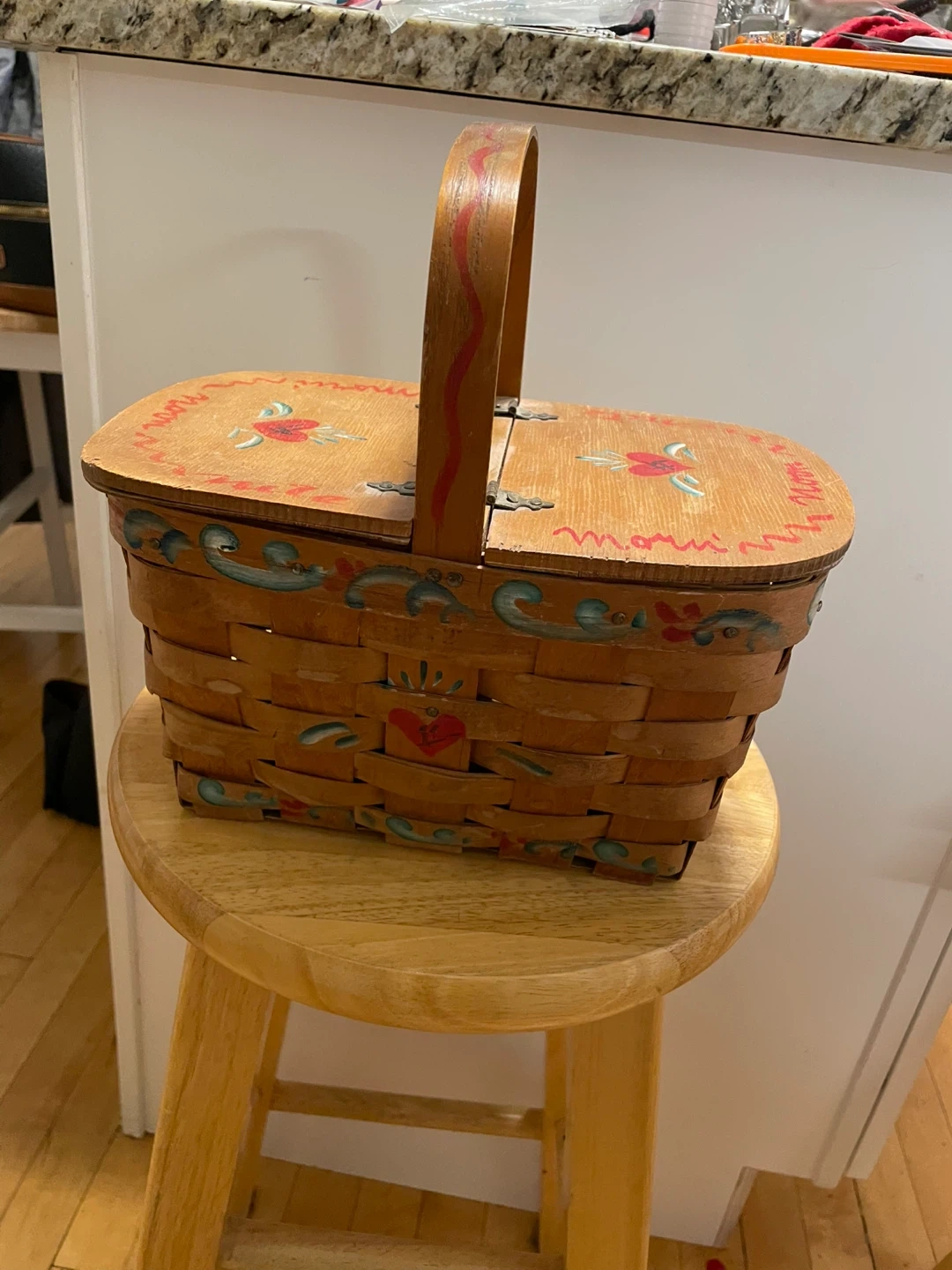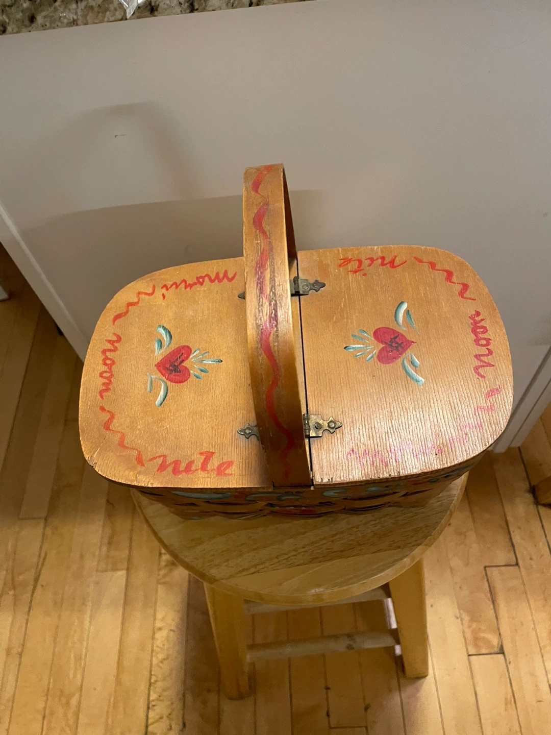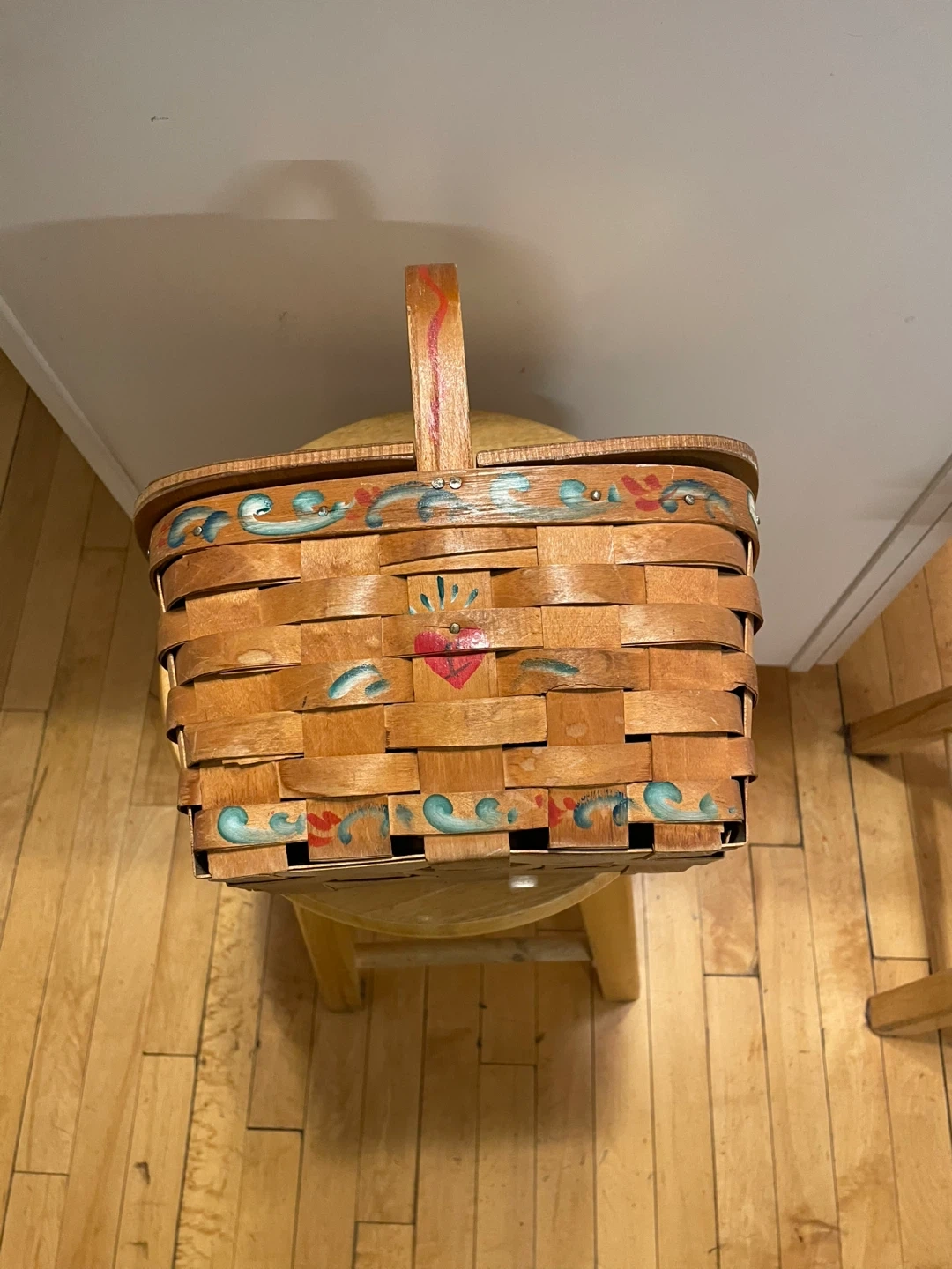 This charming wooden basket features a hand-painted design with a heart and floral motif. It has a hinged lid and a sturdy handle.