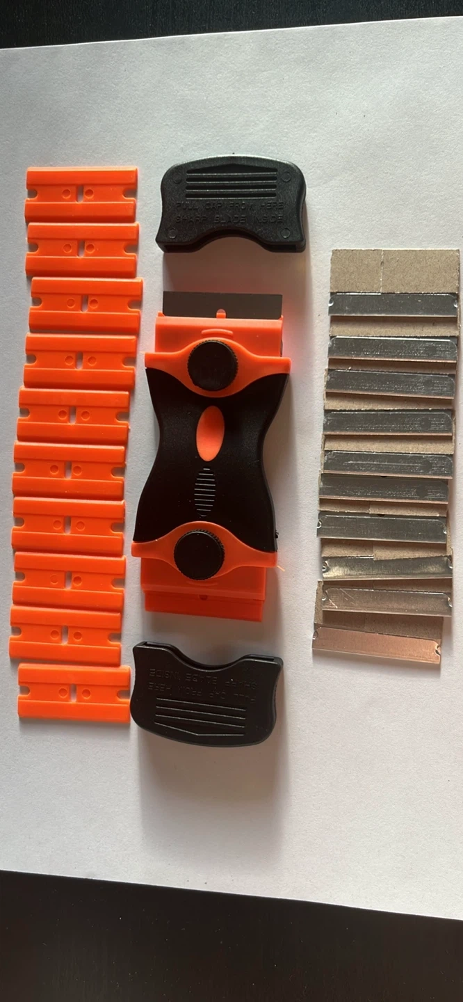 Selling a razor blade scraper tool set. It includes the scraper tool itself along with a selection of both plastic and metal blades. Perfect for removing stickers, decals, or other adhesive residue from surfaces. Great for home or auto use