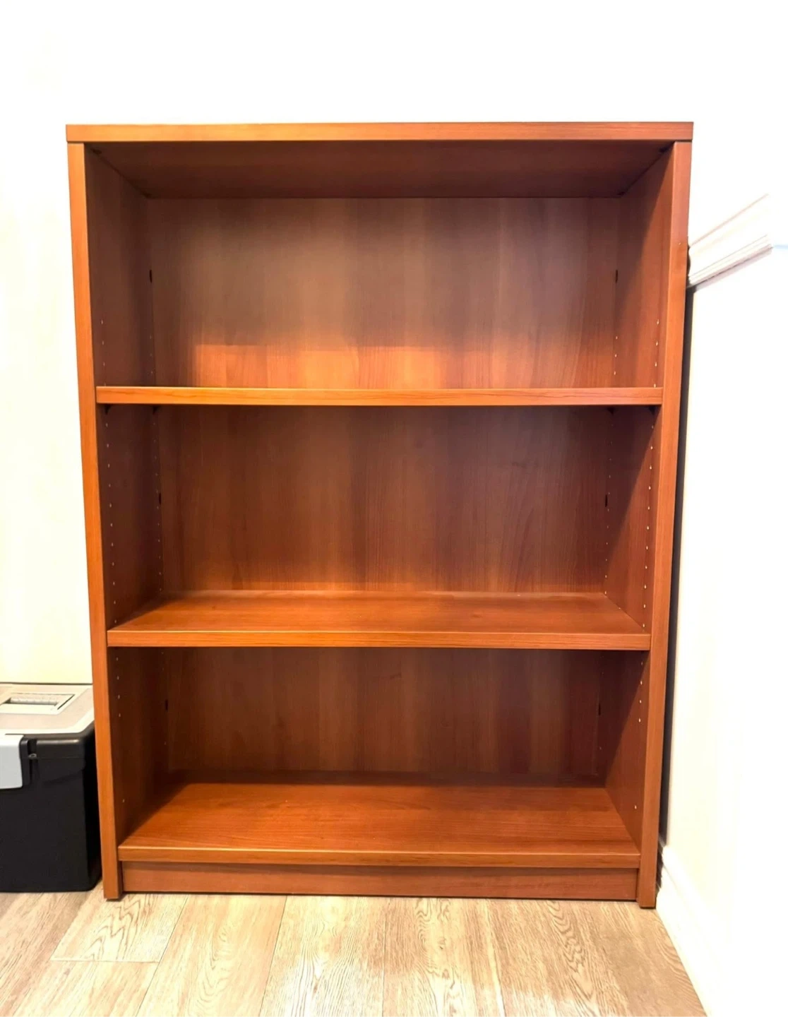 This is a three-shelf wooden bookshelf with a cherry wood finish. It's a practical storage solution for any room. Its simple design makes it versatile for books, decor, or other items.