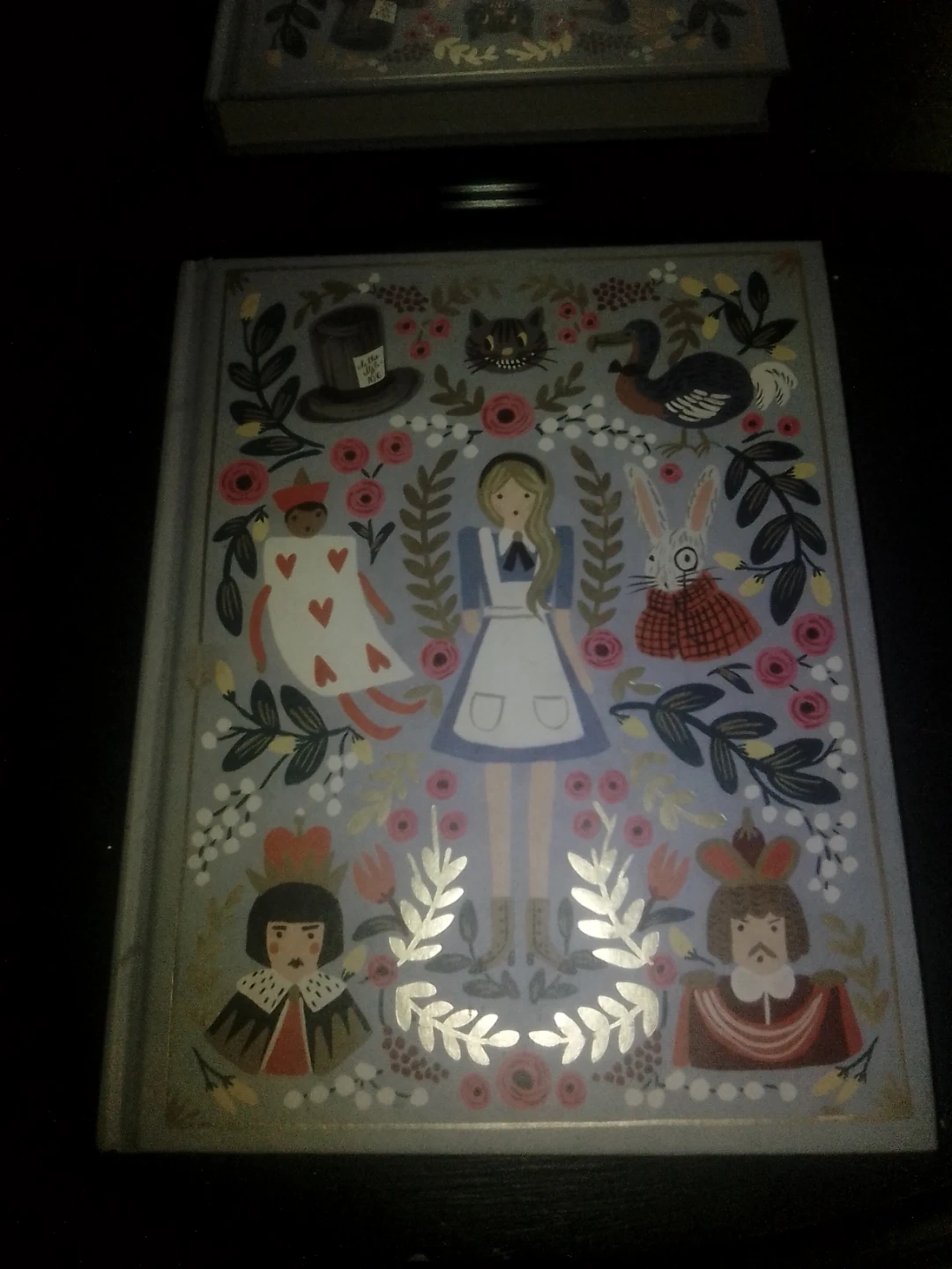 This decorative book features a charming Alice in Wonderland design. It's a hardcover with a colorful illustration on the front. Makes a lovely display piece!