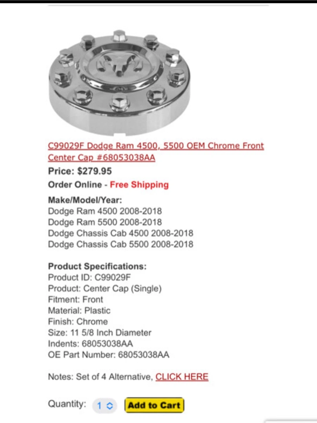 This is a chrome hubcap wheel cover with the Dodge Ram logo. It's a direct replacement part. Fits most Dodge 4500 Ram trucks.Located in Penticton