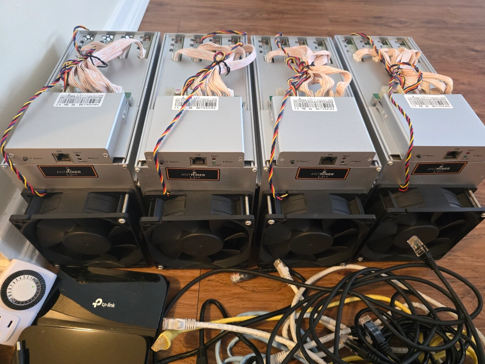 - 4x Antminer L3++ (504–580 MH/s, ~800W each, Scrypt algo) with power supplies, ethernet cables, and all necessary cables. Equipped with Blissz firmware for adjustable fan speed to save on bills.