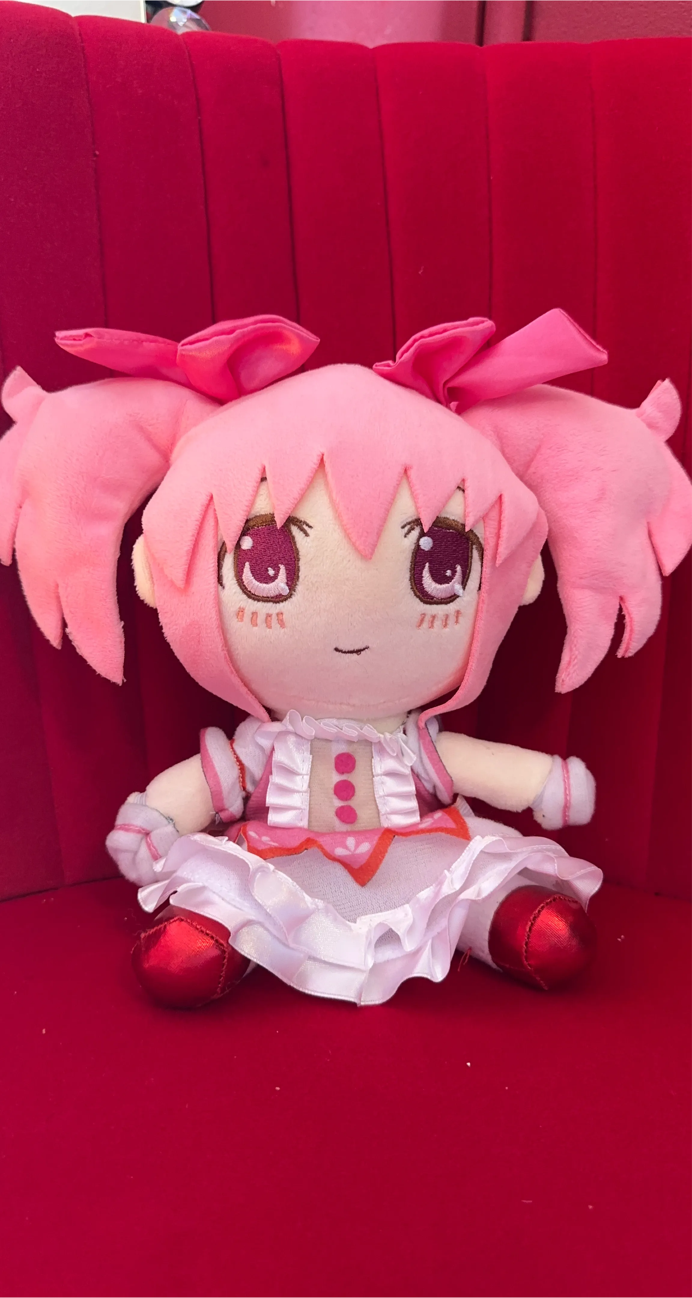 A cute plush toy of an anime character. It's soft and cuddly, perfect for fans of anime. This toy has pink hair styled in pigtails with bows and wears a pink and white dress :))