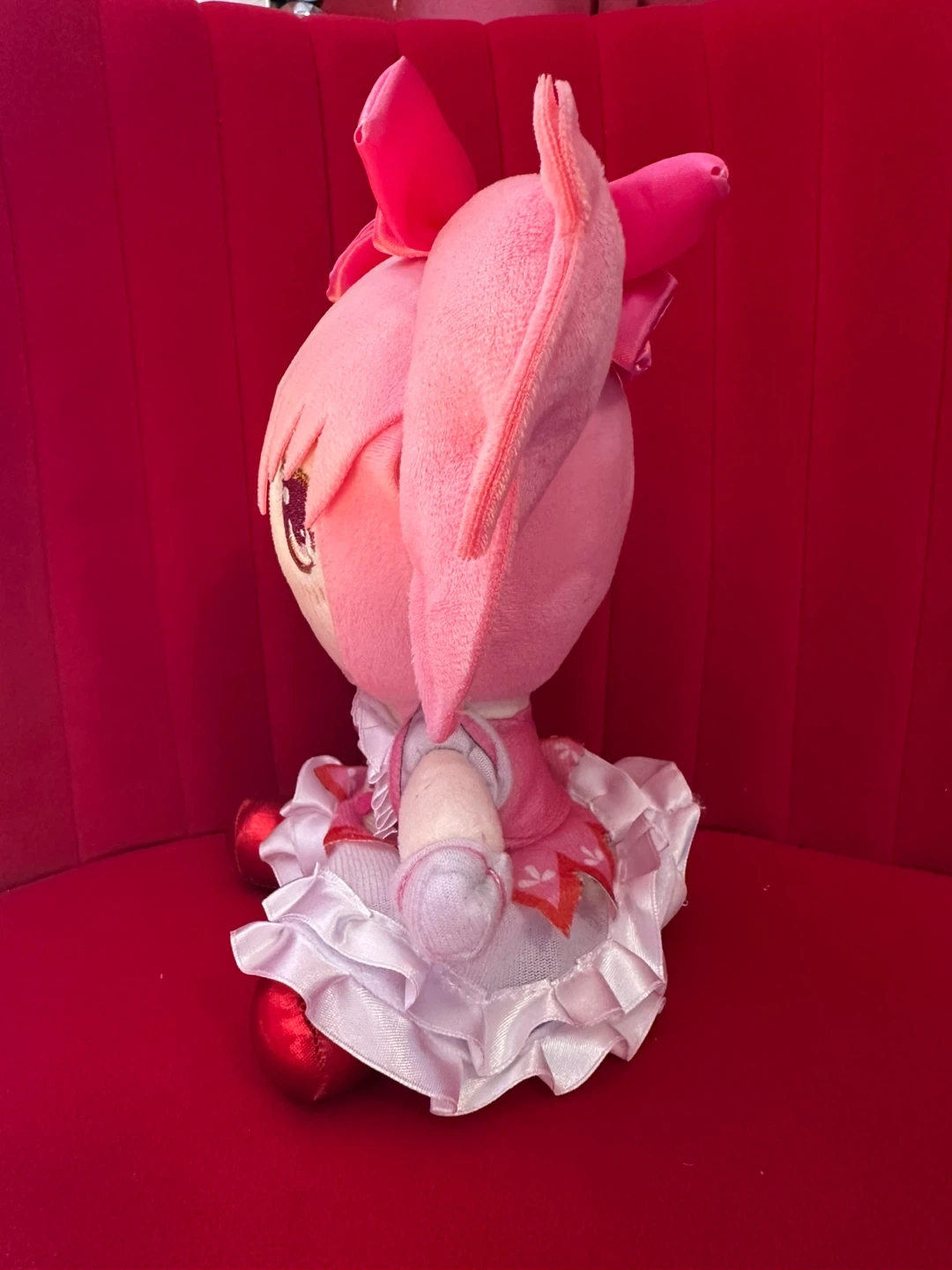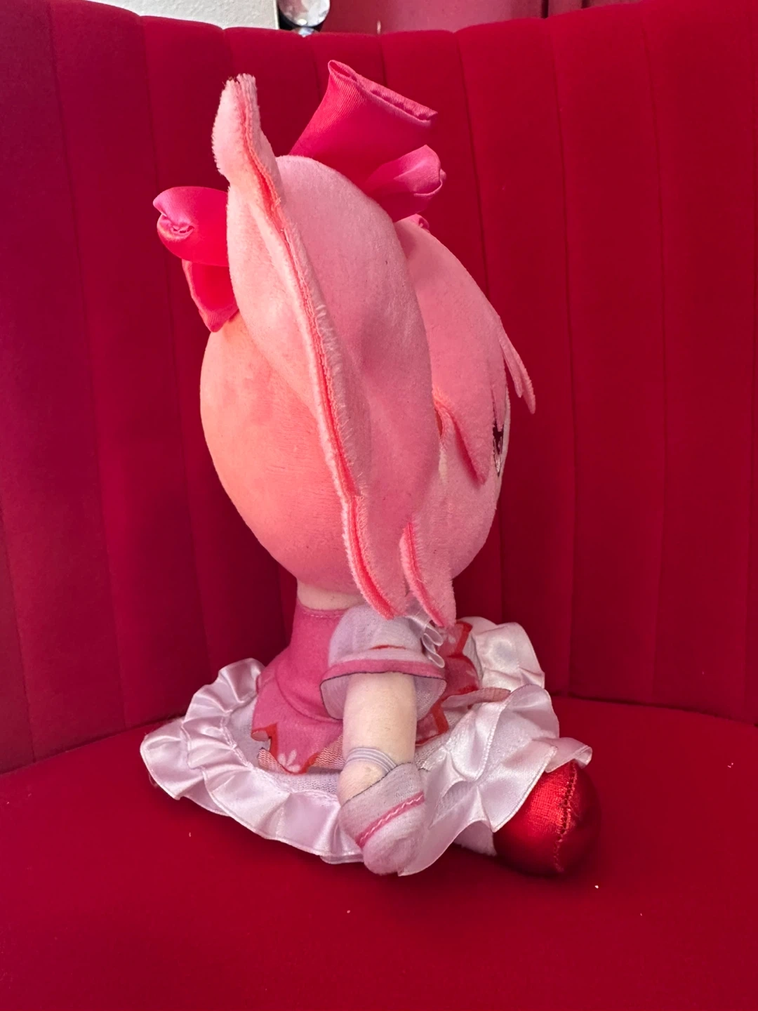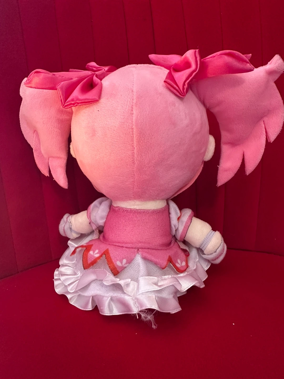 A cute plush toy of an anime character. It's soft and cuddly, perfect for fans of anime. This toy has pink hair styled in pigtails with bows and wears a pink and white dress :))