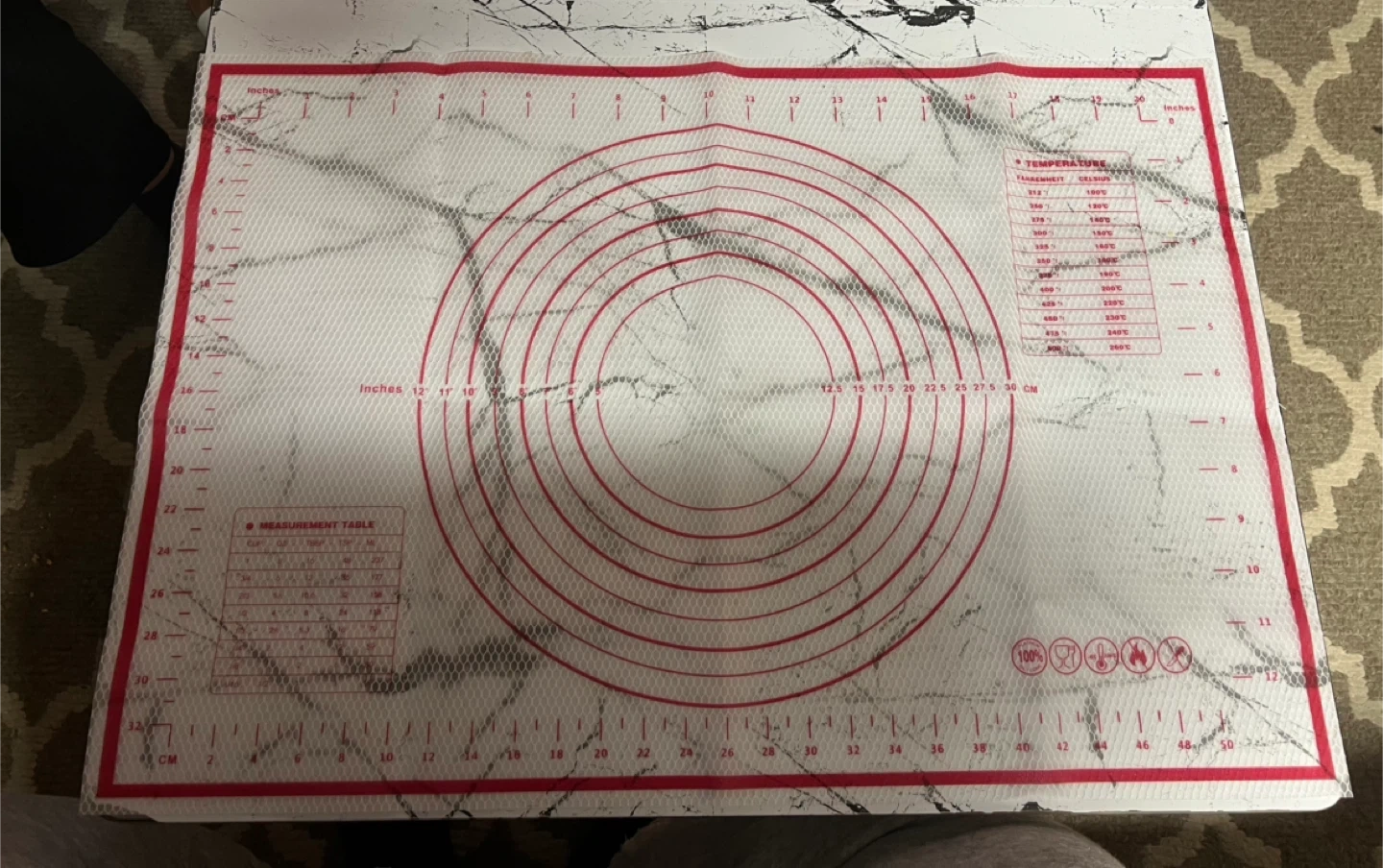 This silicone baking mat is perfect for all your baking needs! It features helpful measurements in both inches and centimetres, as well as temperature conversions. It's in great condition and ready to help you create delicious treats