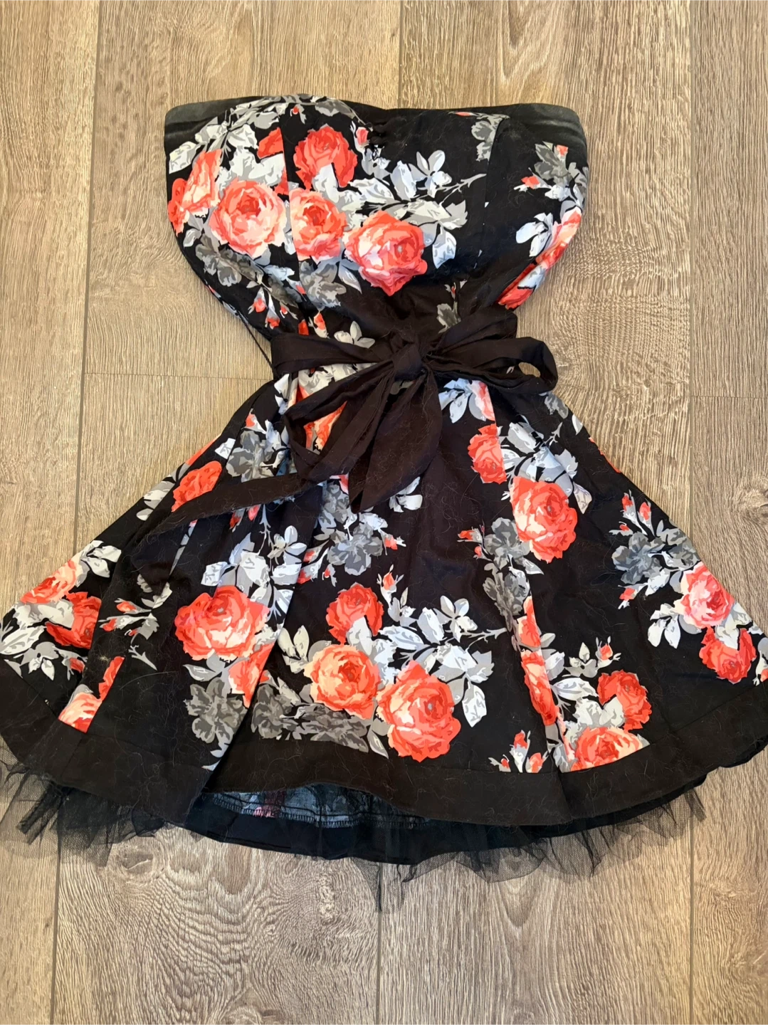 Strapless black dress with a vibrant floral print featuring roses and grey foliage. It has a sweetheart neckline, a cinched waist with a tie sash, and a playful black tulle hem. This dress is perfect for a summer party or a casual outing!