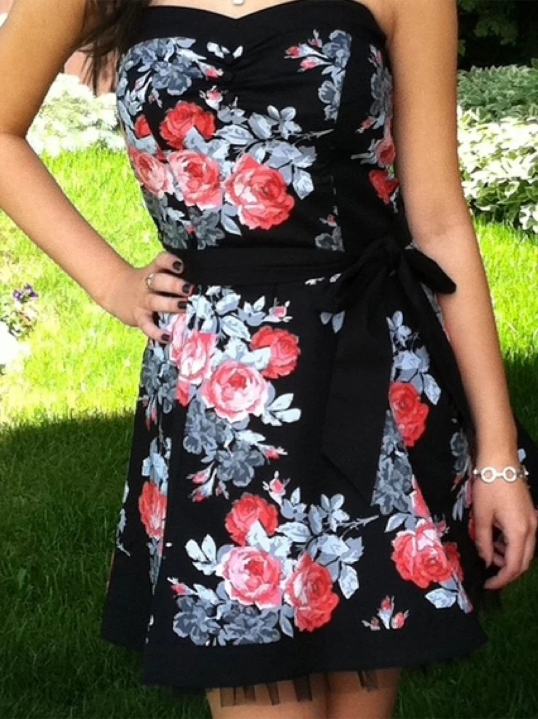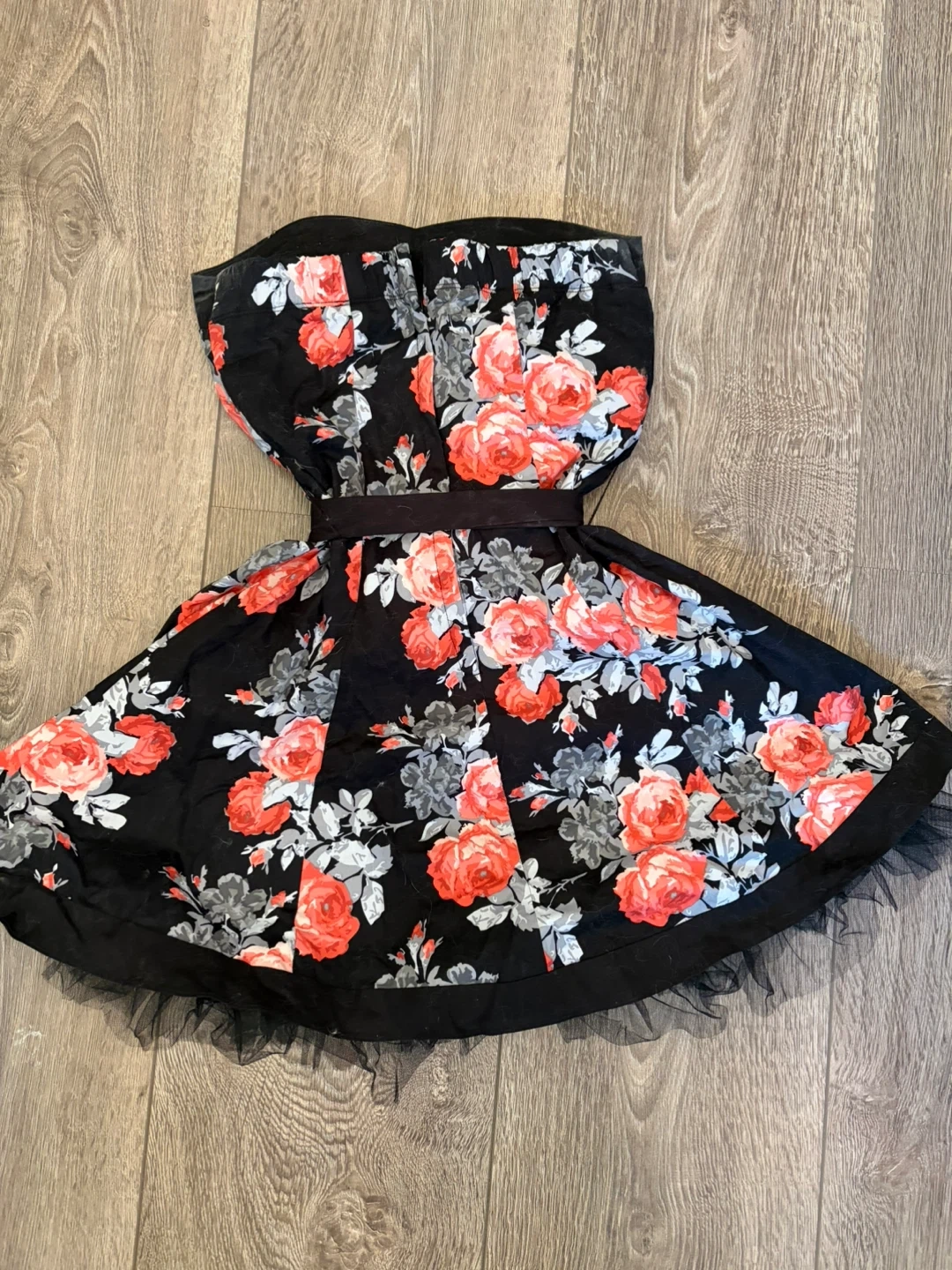 Strapless black dress with a vibrant floral print featuring roses and grey foliage. It has a sweetheart neckline, a cinched waist with a tie sash, and a playful black tulle hem. This dress is perfect for a summer party or a casual outing!