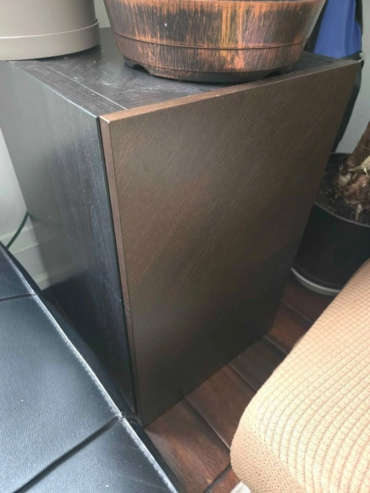 2. Small side table/storage cabinet. Black body, brown front. 15" wide, 24" tall, 16.5" deep.