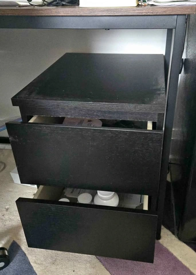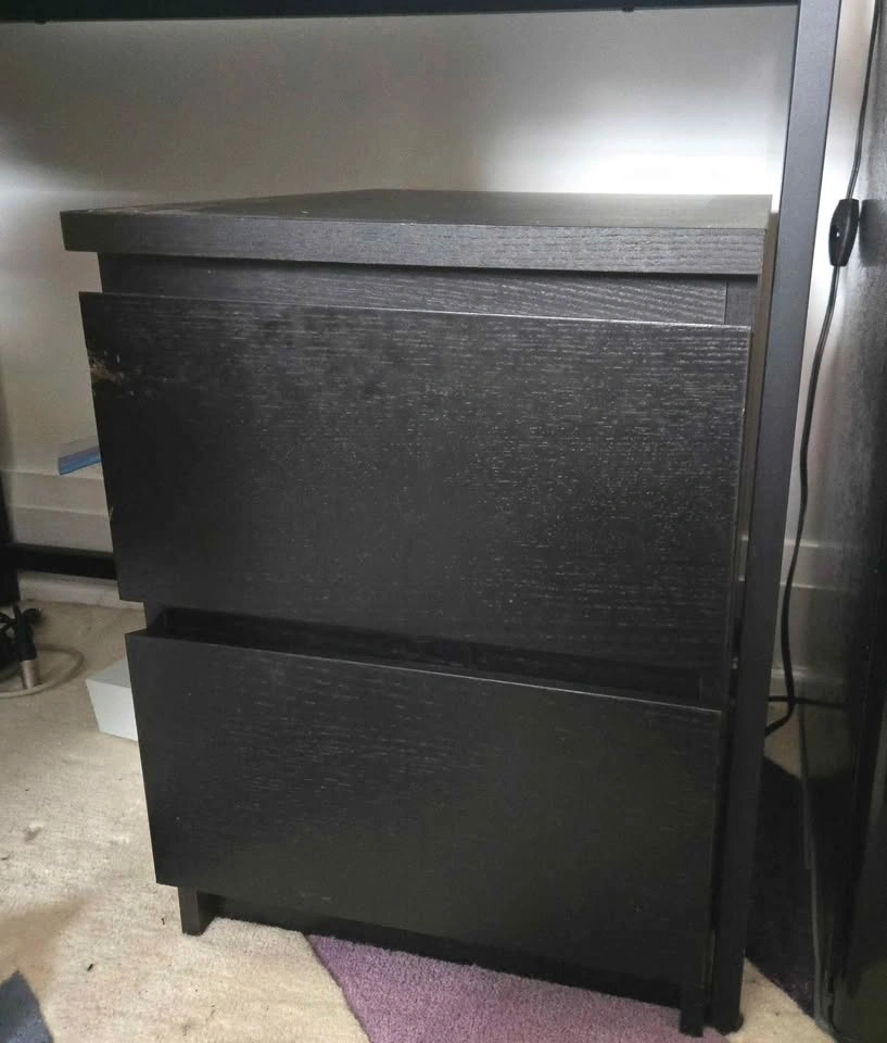 1. Small wooden black cabinet. 16" wide, 22" deep, 21" height. 2 drawers.