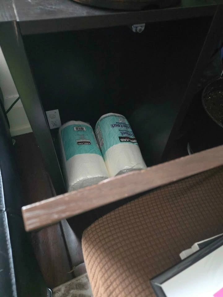 2. Small side table/storage cabinet. Black body, brown front. 15" wide, 24" tall, 16.5" deep.