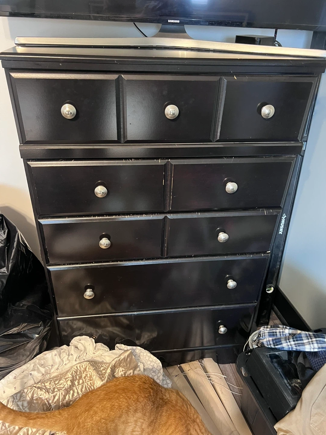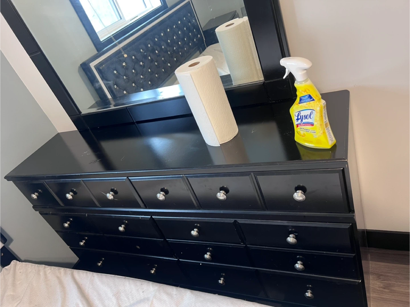This set includes 2 dressers with 2 matching night stands. All pieces are black with silver hardware. They're great for bedroom storage!