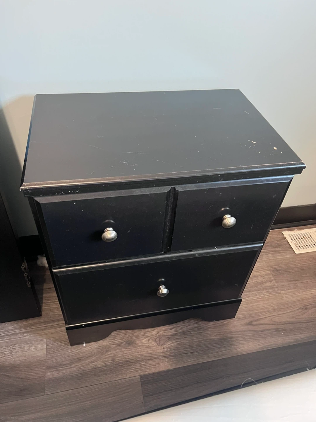 This set includes 2 dressers with 2 matching night stands. All pieces are black with silver hardware. They're great for bedroom storage!