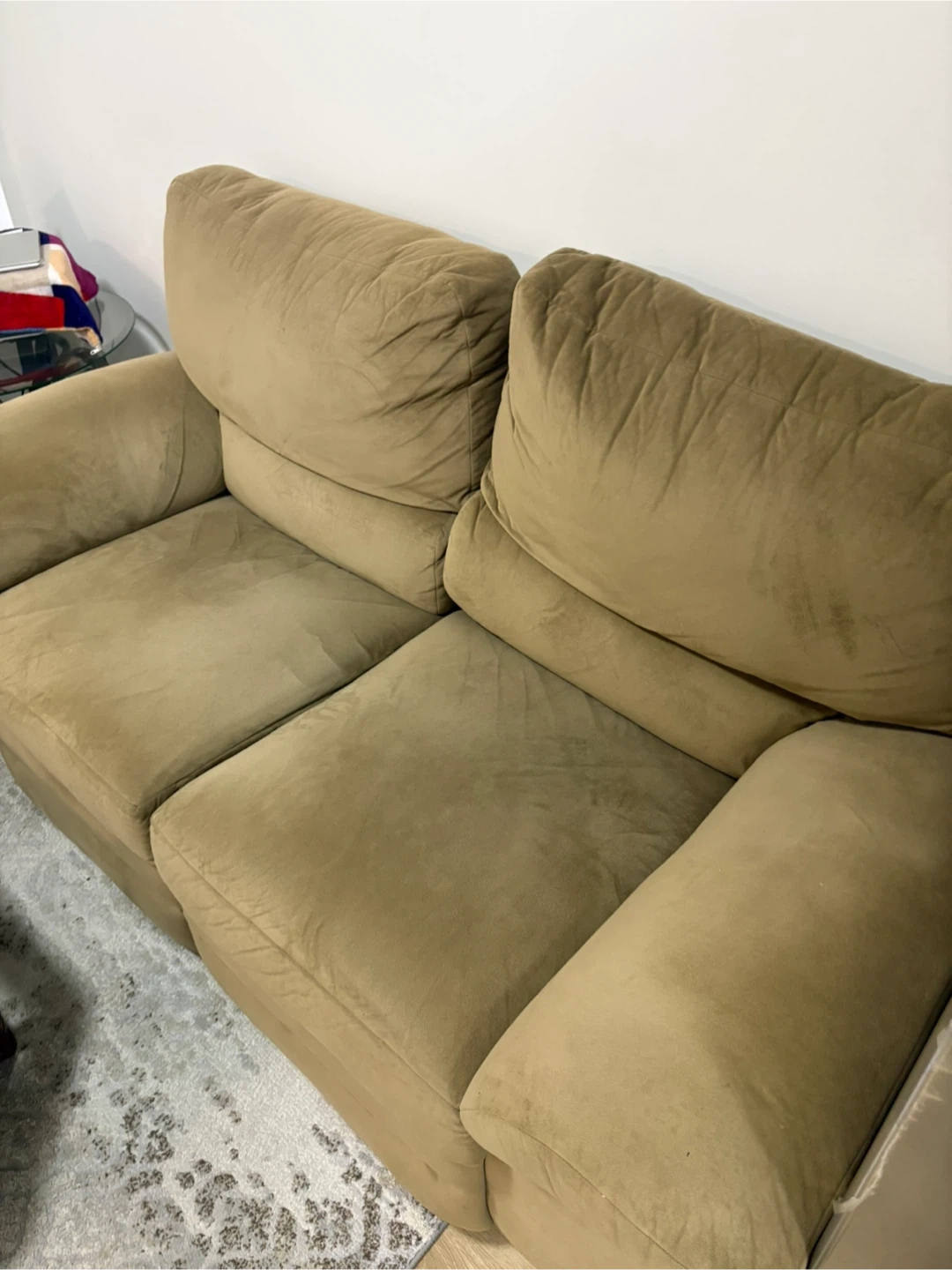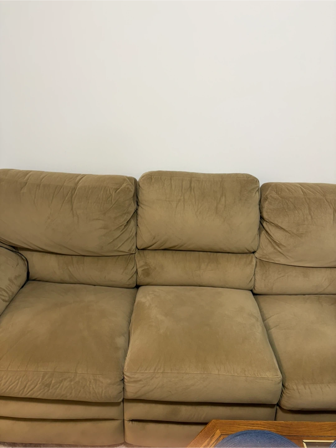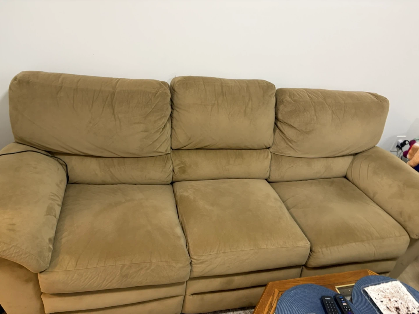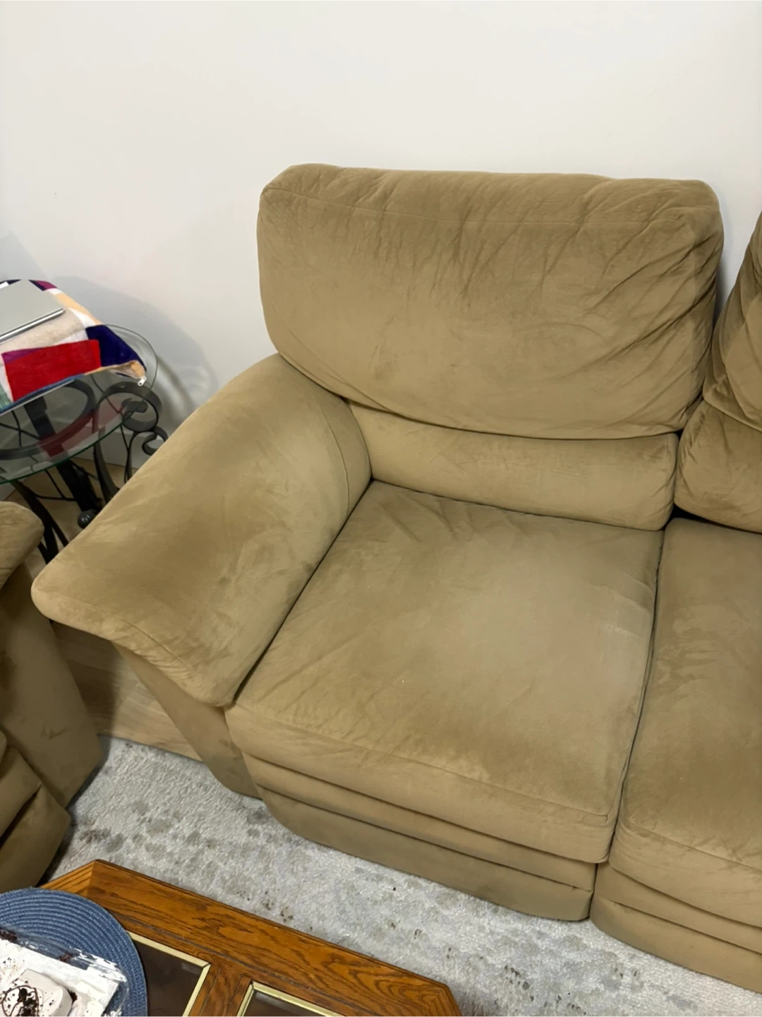 A comfortable tan reclining sofa set with a loveseat and sofa. Both pieces feature reclining seats for ultimate relaxation. Upholstered in a soft fabric.