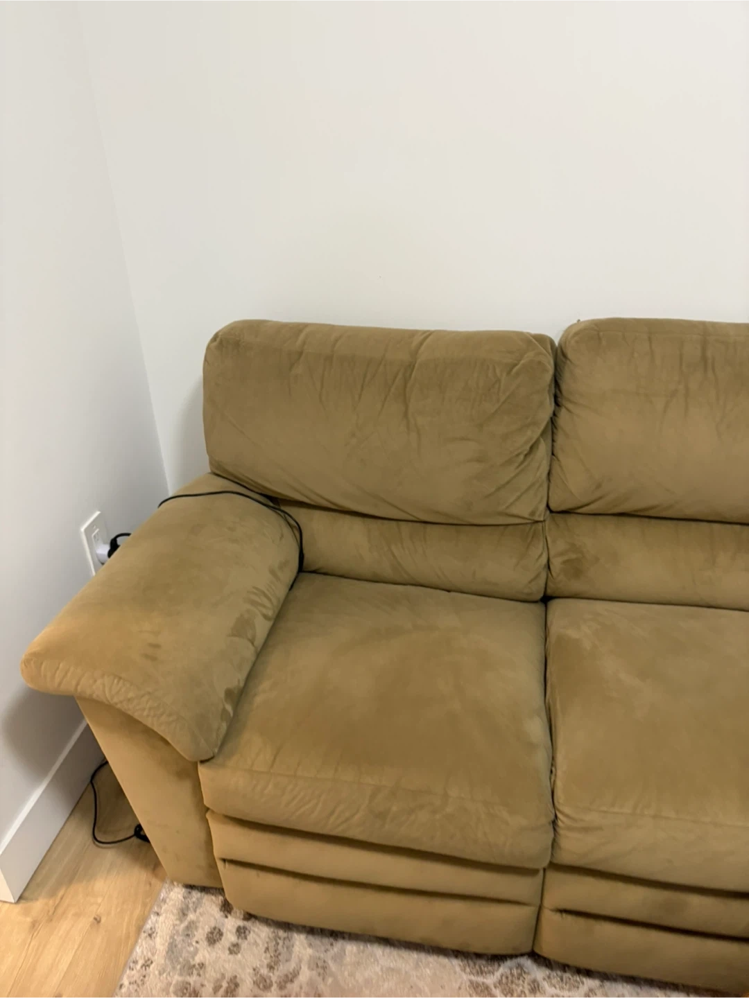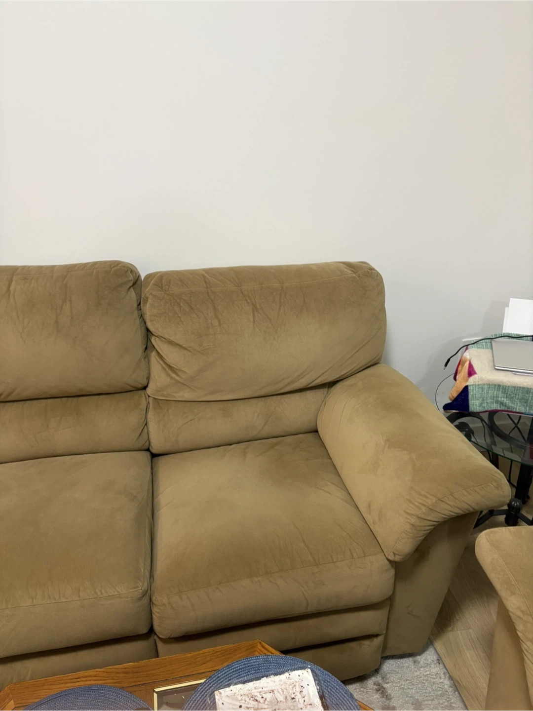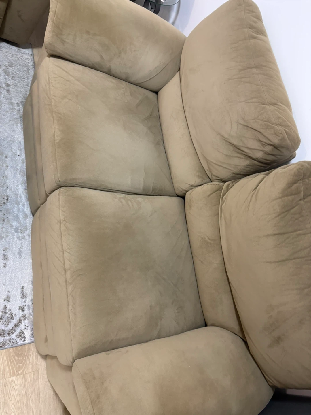 A comfortable tan reclining sofa set with a loveseat and sofa. Both pieces feature reclining seats for ultimate relaxation. Upholstered in a soft fabric.