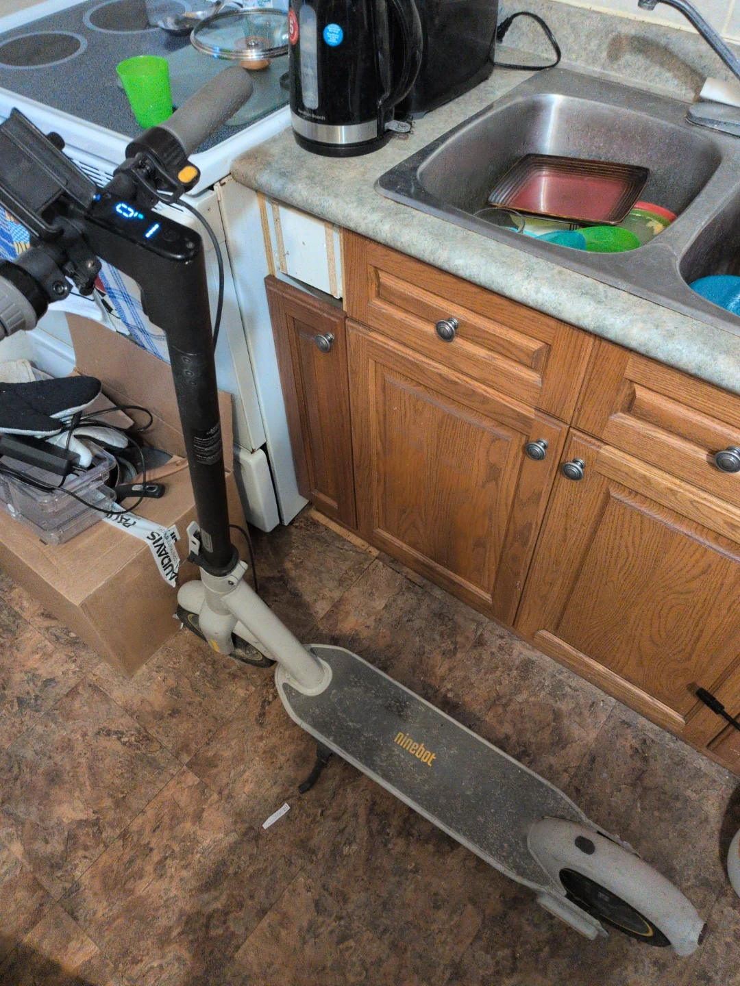 This is a Ninebot electric scooter. It's a personal mobility device for getting around. The deck is grey with the Ninebot logo in yellow. It has a digital display on the handlebars showing speed & battery. Unfortunately doesn't come with charger