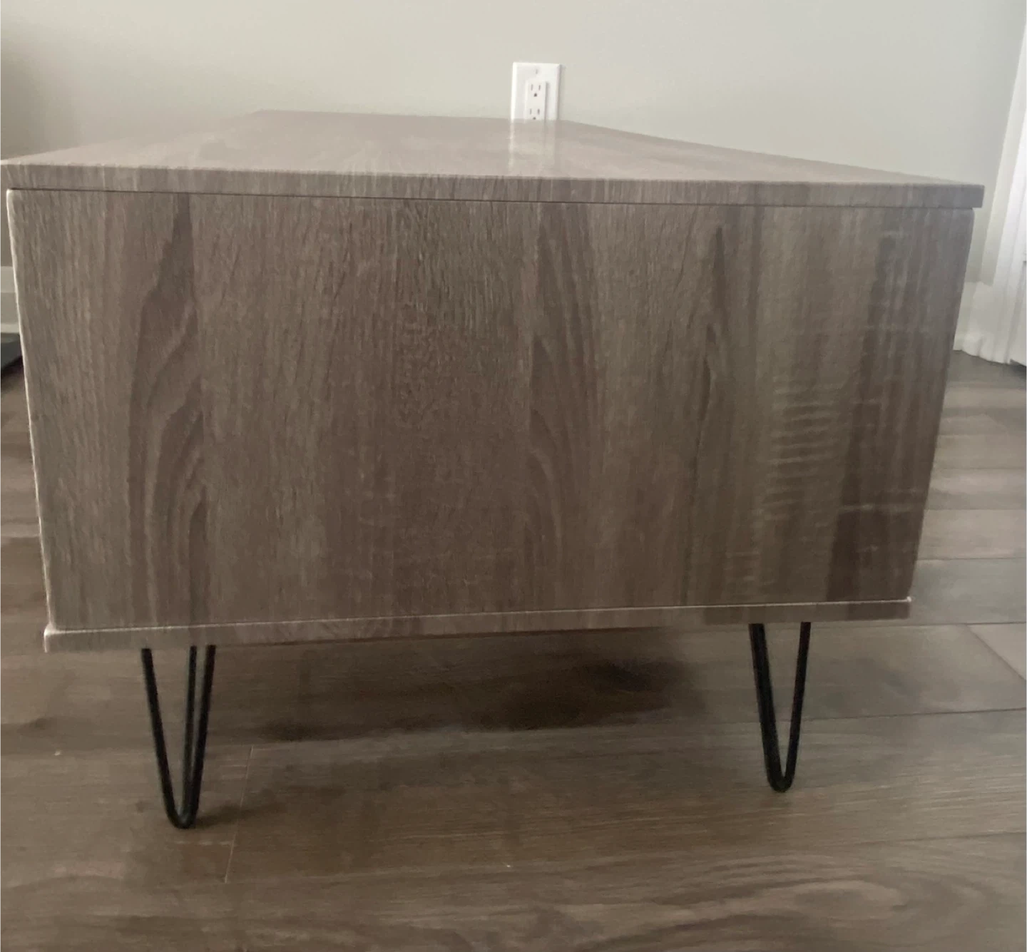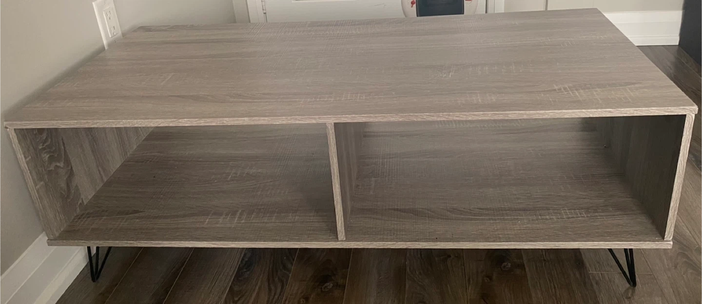 This coffee table has a modern, minimalist design with a wood-grain finish. It features two open storage compartments, perfect for books or decor. The table rests on black hairpin legs for a stylish look.