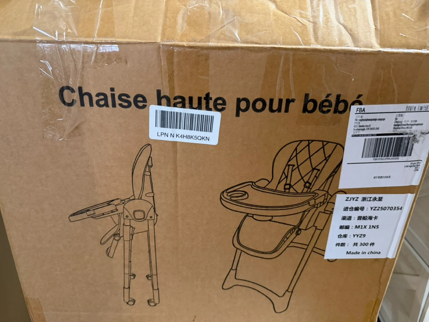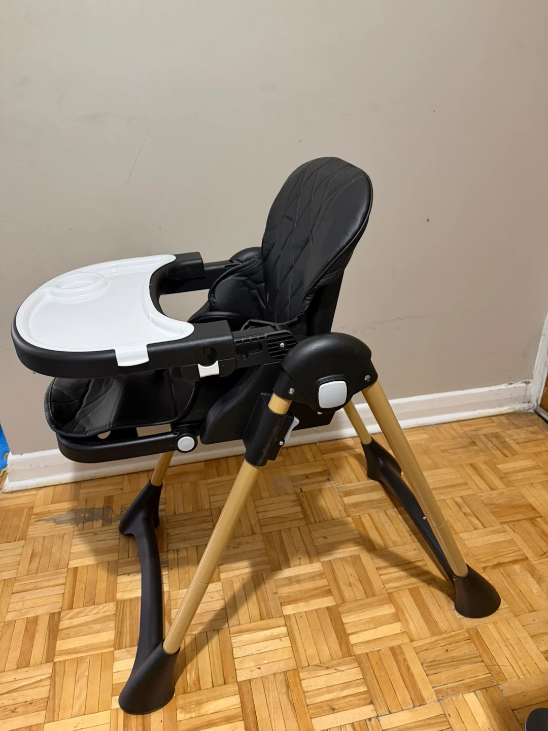 This Infantino baby high chair is black with a white tray. It's designed for safe meal times. Includes original box.