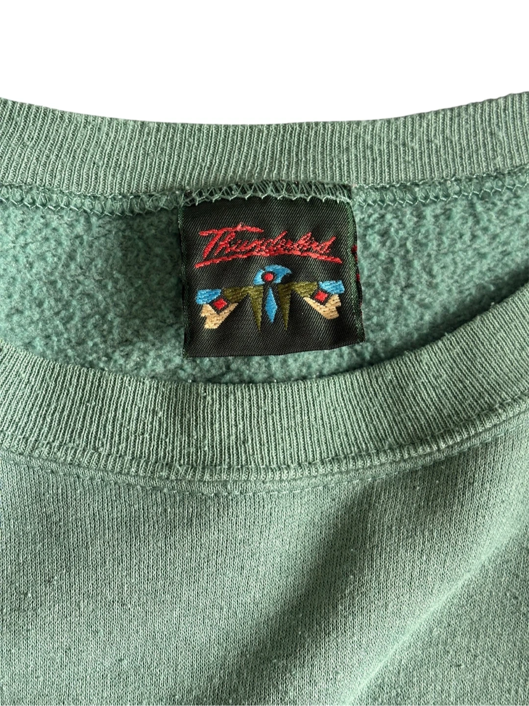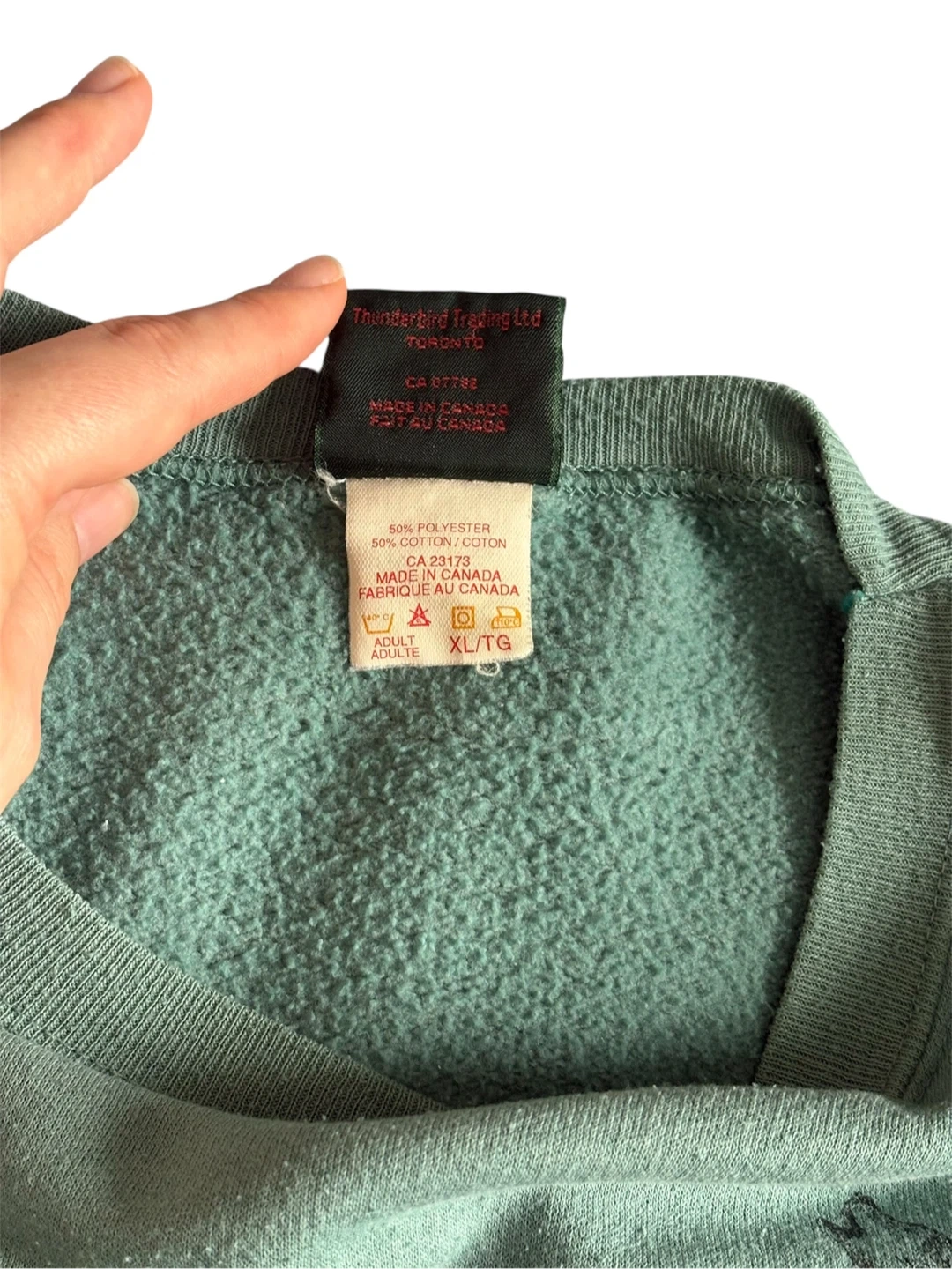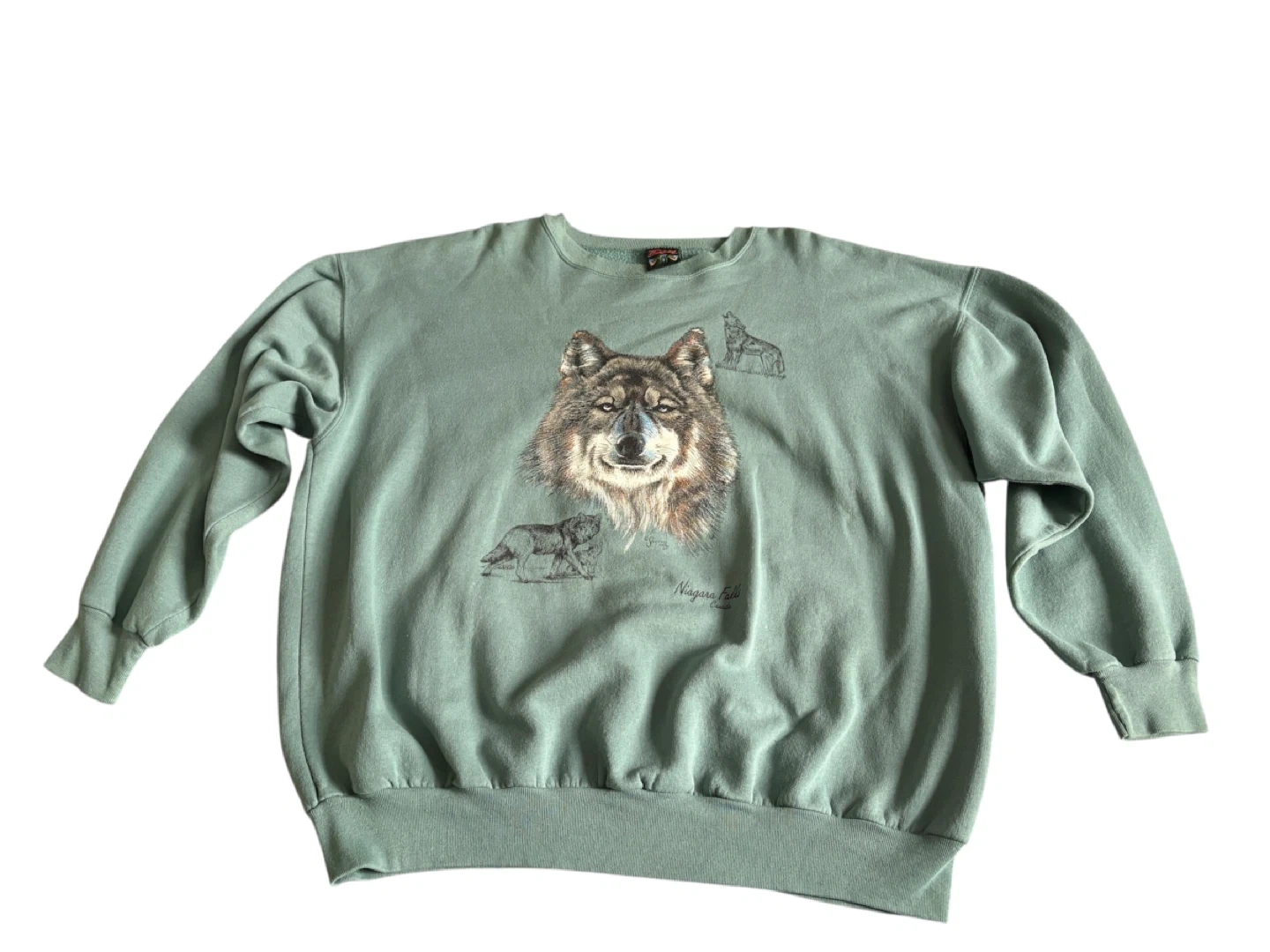 Embrace the wild with this stylish green sweater featuring a striking wolf print. Perfect for casual outings, this sweater combines comfort with a touch of nature-inspired design. Cotton/poly blend. In good used condition. 28” pit to pit.
