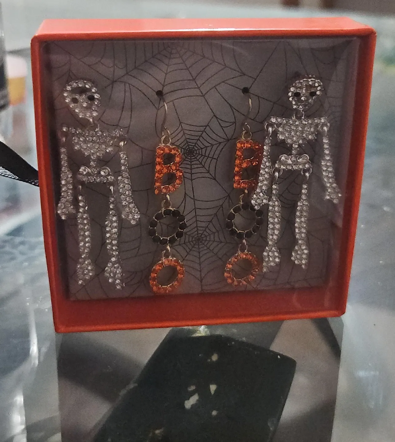 These spooky skeleton earrings are perfect for Halloween! They come in their original box and feature a fun design with skeletons and "BOO" charms. Get ready to add a festive touch to your outfit! HAPPY HALLOWEEN 🎃