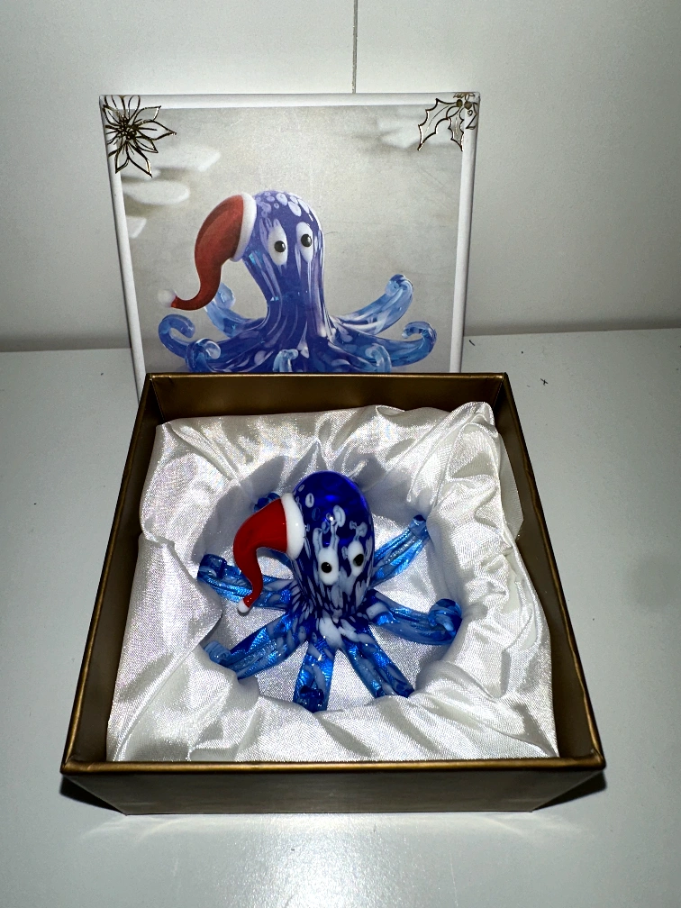 95This is a beautiful Glass Baron hand-blown glass octopus figurine wearing a Santa hat. It comes in its original box with satin lining. Perfect for a Christmas decoration or a unique gift!