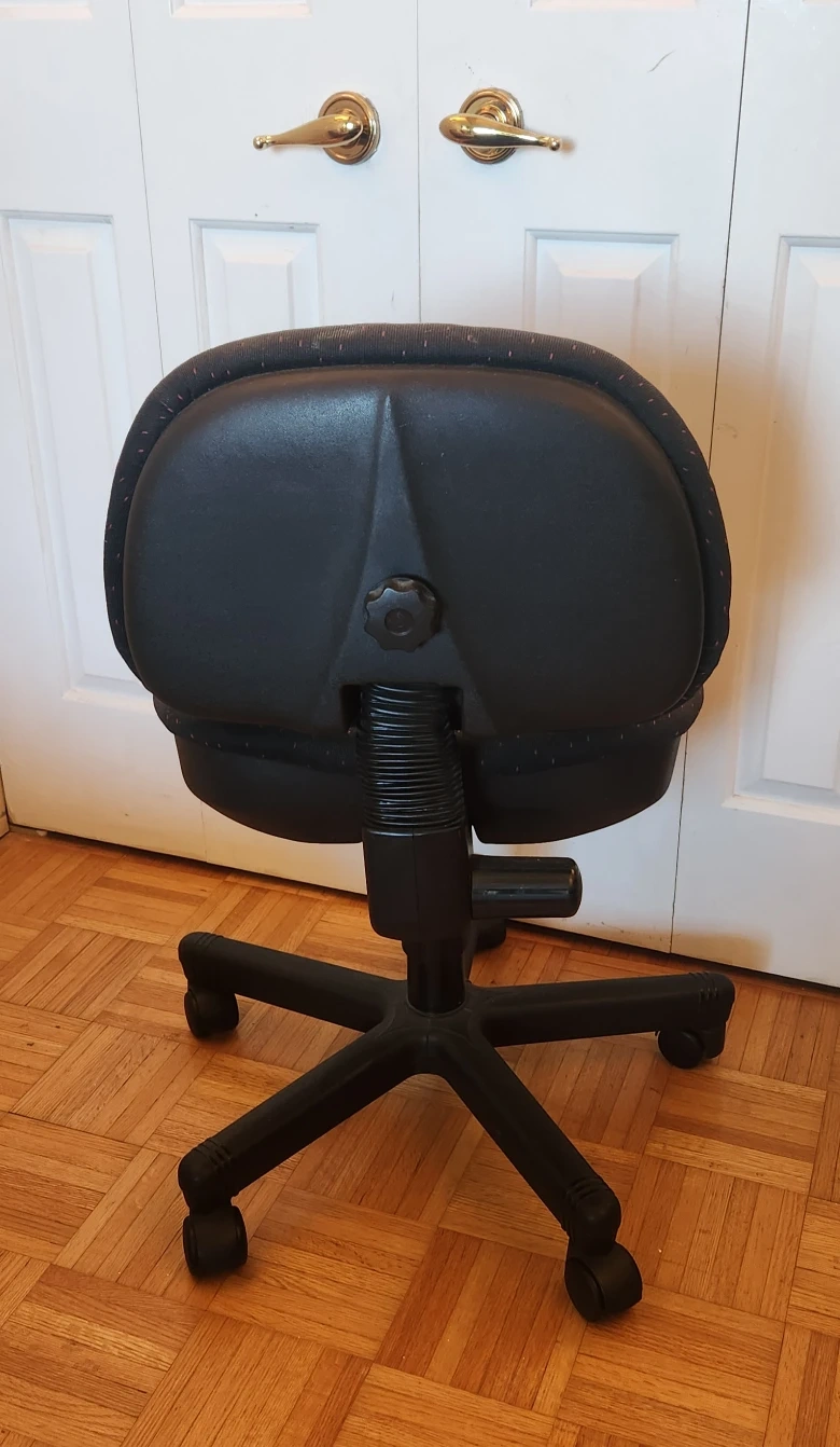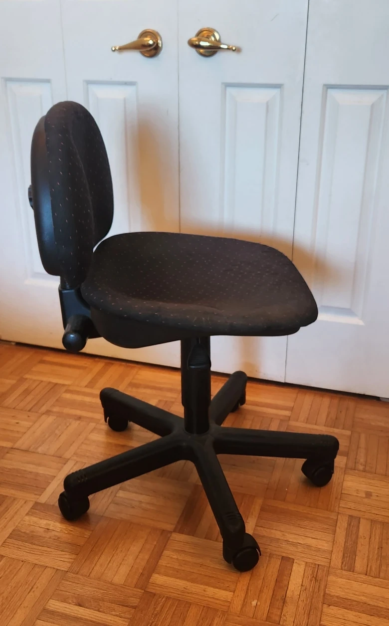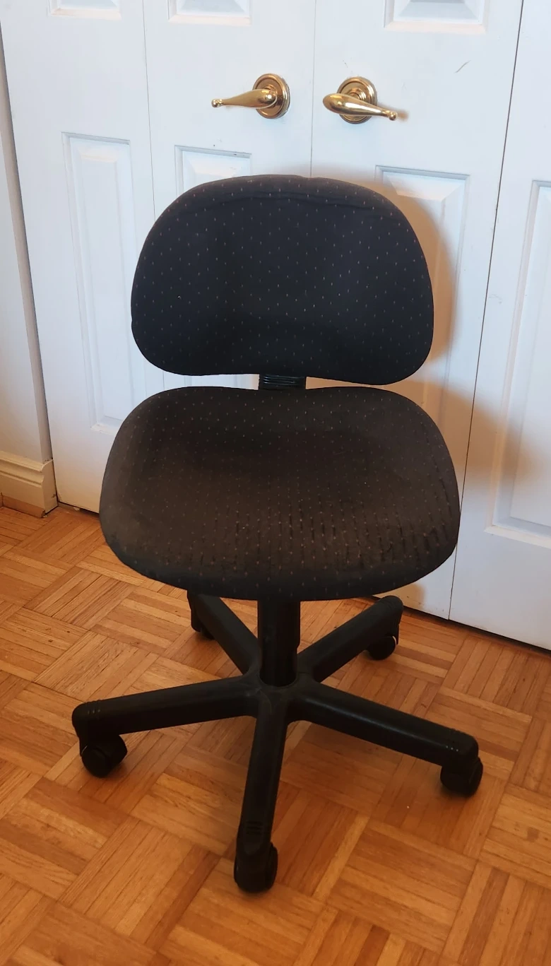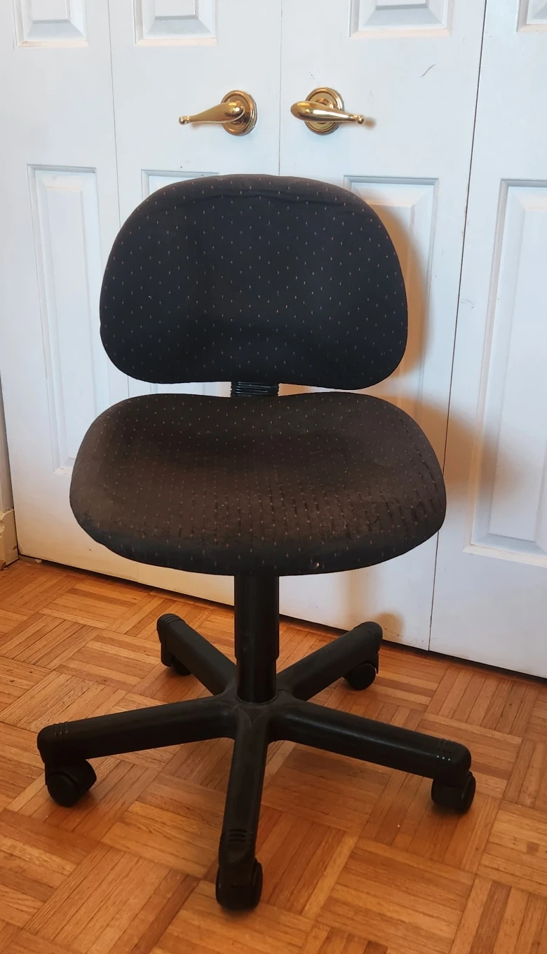 349Selling a used office chair in black. It's in good condition and perfect for a home office or student desk. The chair has a comfortable seat and back, and it rolls smoothly on the wheels. It's also height adjustable to suit your needs