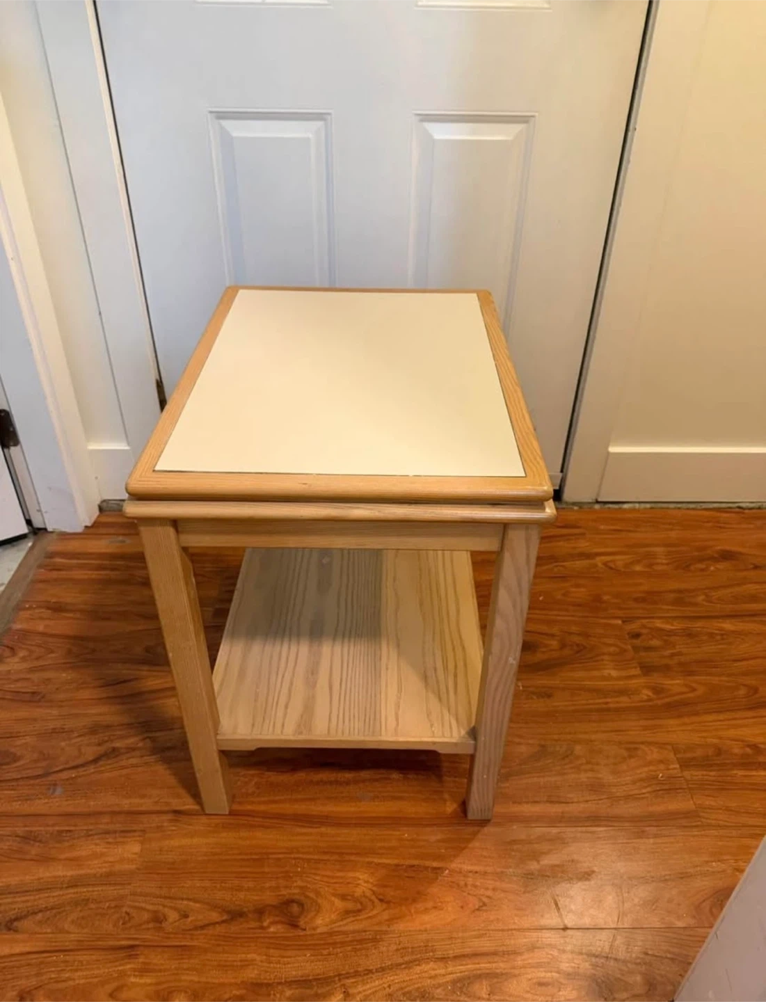 Selling a gently used side table! It's in good condition and measures approximately 26 inches in height. Perfect for a bedside table or to place next to your couch