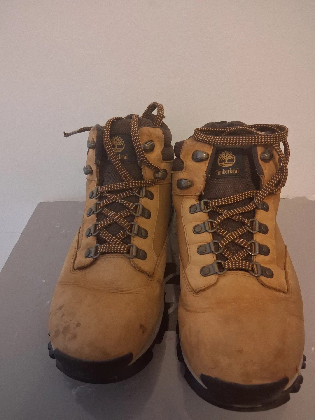 Selling a pair of Timberland hiking boots in size 9 US. They're in good condition and ready for some outdoor adventures. Perfect for hiking or just everyday wear!