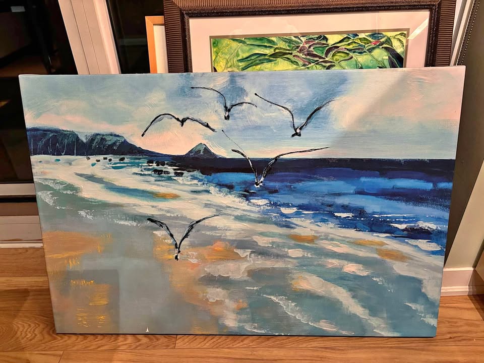 Lightweight, beautiful painting on canvas. Online price $300+. Ready to hang with wire on back. Small white tear barely visible towards bottom of painting, images included, price reflects this. Yonge and eglinton area pickup. 42” x 28” x 1”5/8