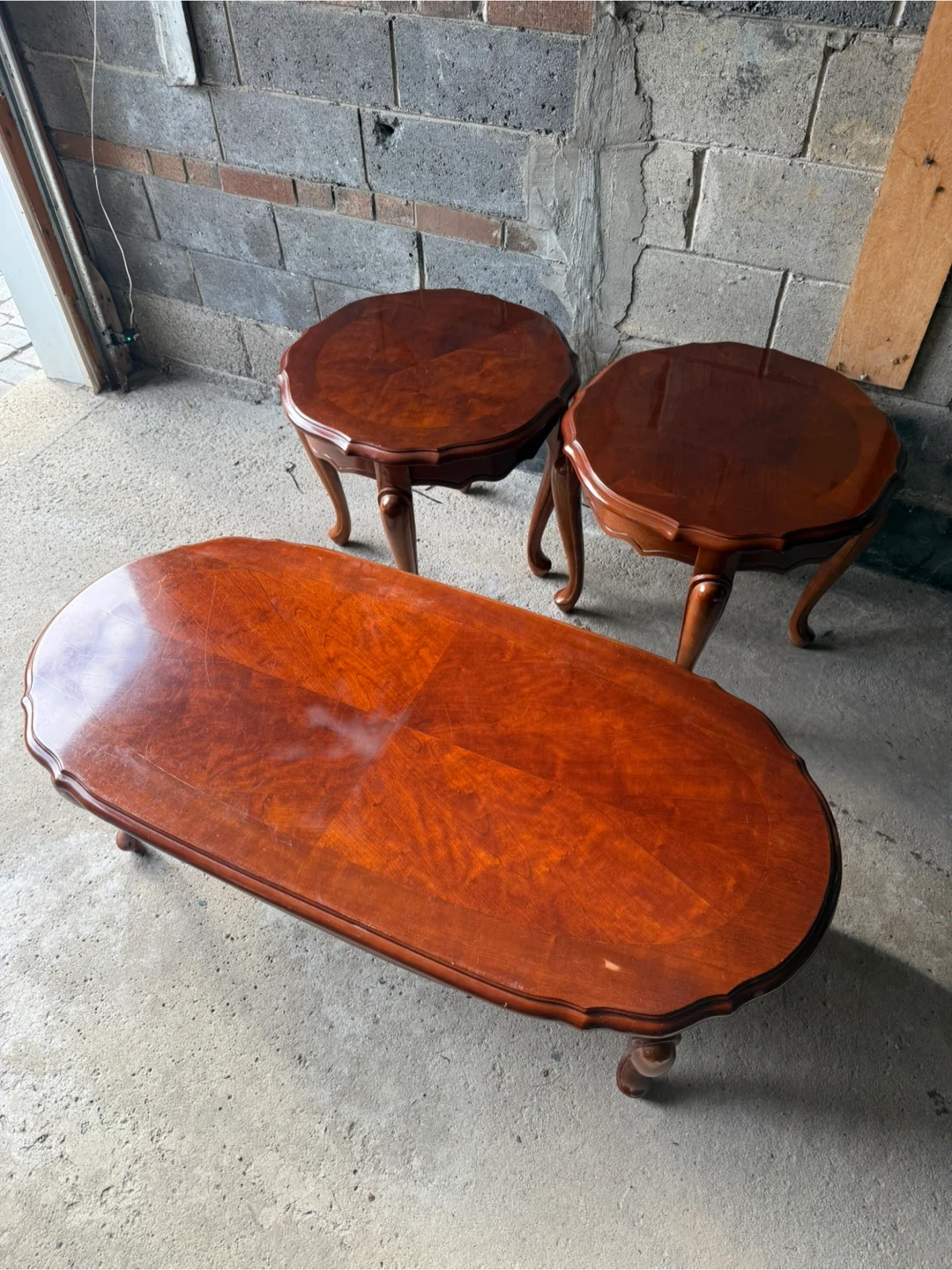 Selling a lovely 3-piece coffee table and end table set. The set includes one oval coffee table and two round end tables. They have a beautiful wood finish and classic design that would look great in any living room!