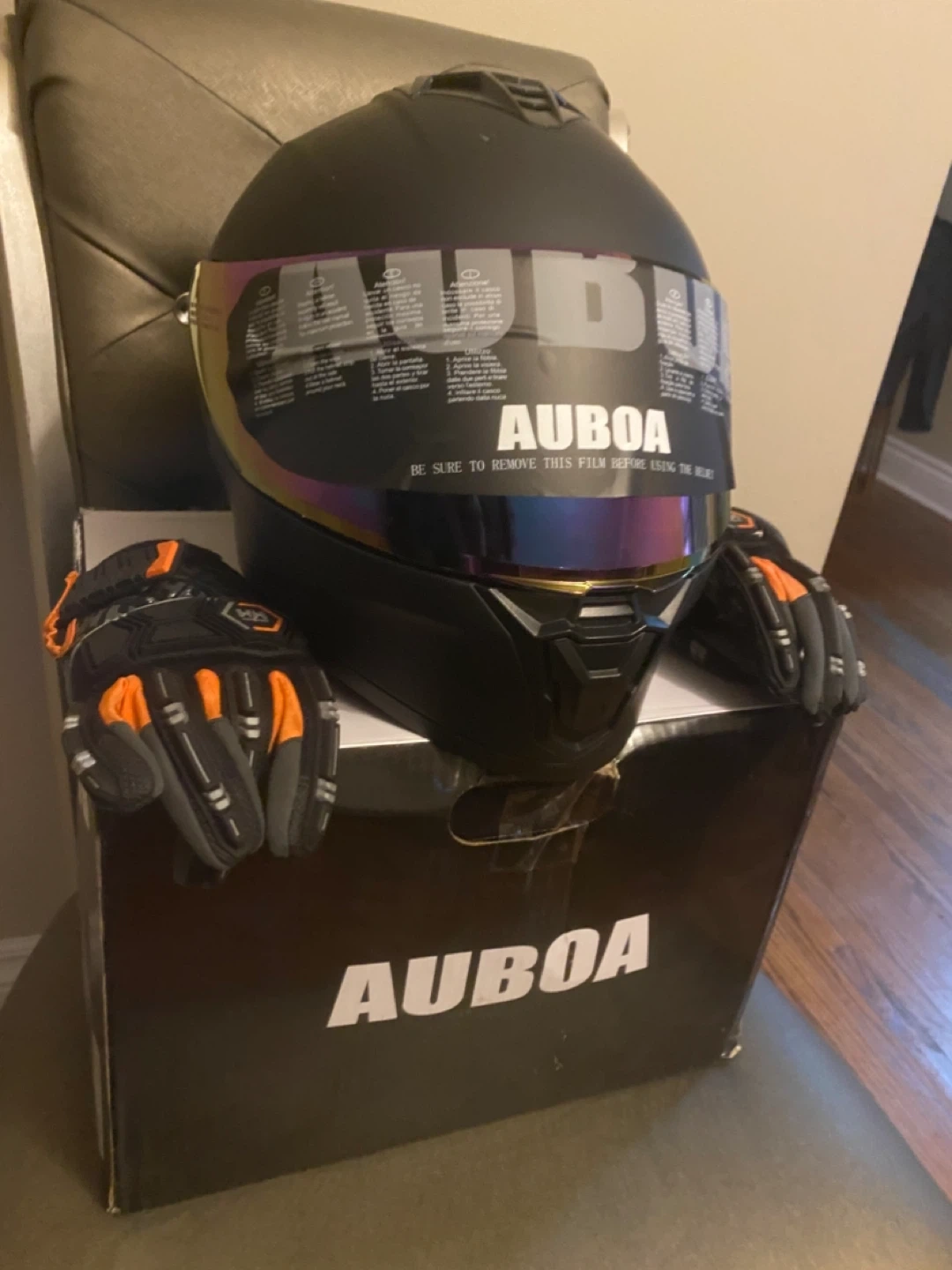 Selling an AUBOA AU-T801 motorcycle helmet in matte black, size medium (57-58 cm). It's DOT certified and comes with its original box! Also included are a pair of riding gloves.