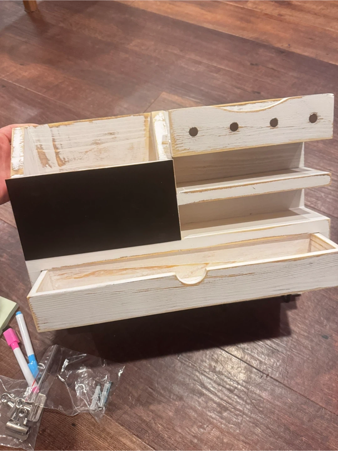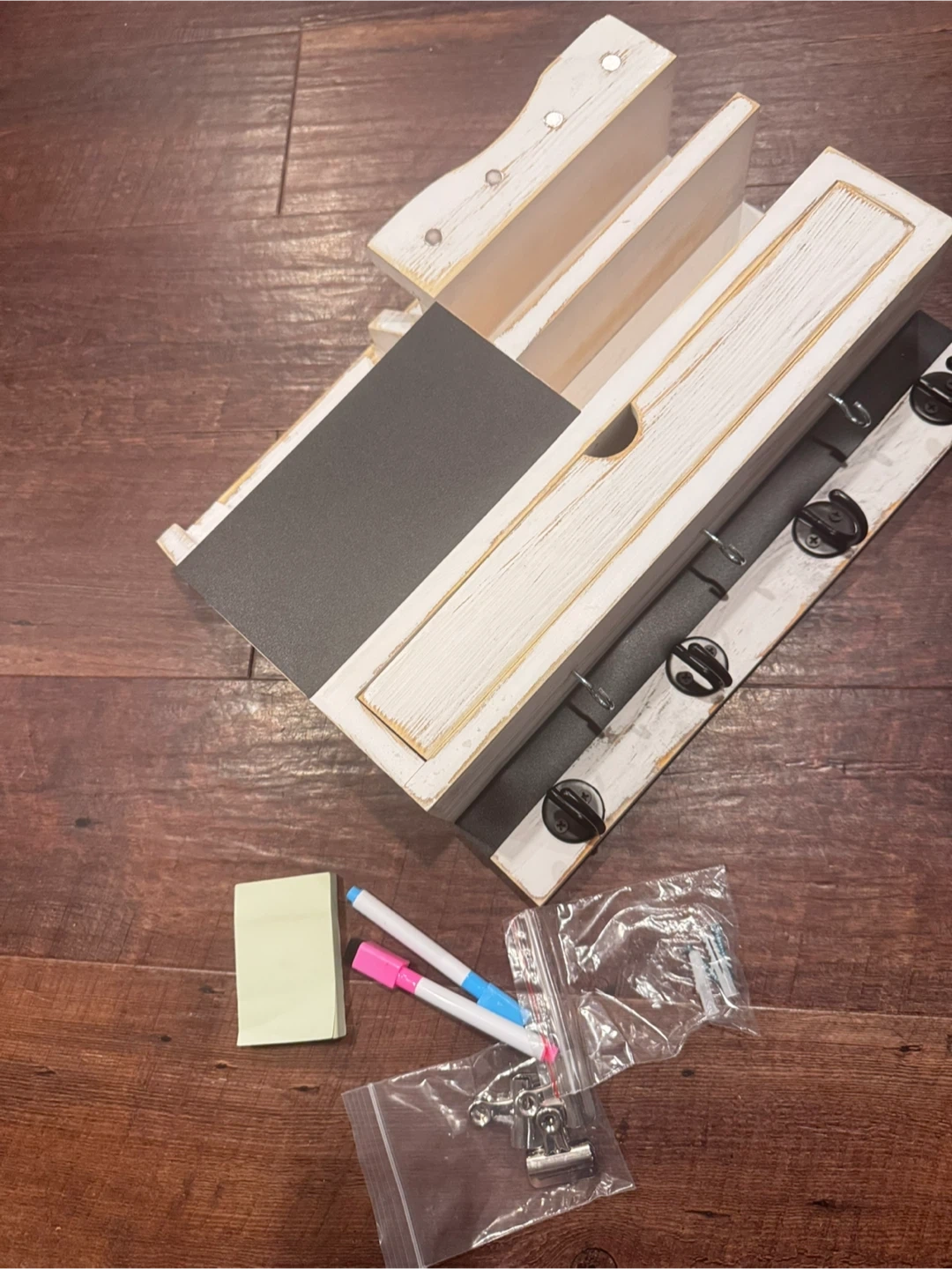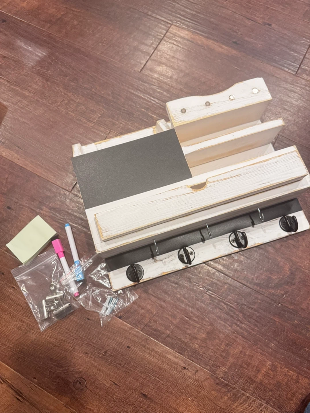 Declutter your entryway with this handy organizer! It features a chalkboard, mail slots, and hooks for keys or coats. It's in great condition and ready to help you stay organized