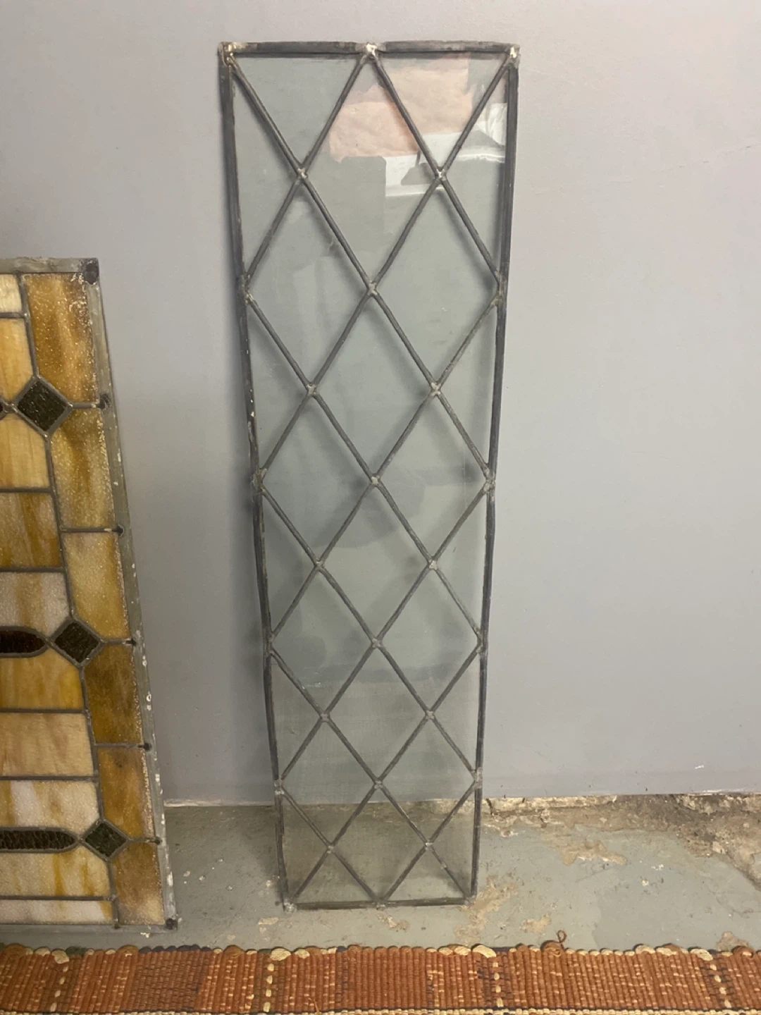 Selling a vintage stained glass window panel. It has a diamond pattern and would make a great addition to any home. It's in good condition for its age, with a lovely patina.