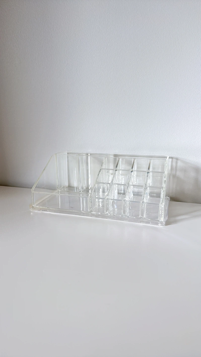 It's in great condition and perfect for keeping all your cosmetics tidy. It has various compartments to fit different sized items like lipsticks, brushes, and palettes. A great way to declutter your space!