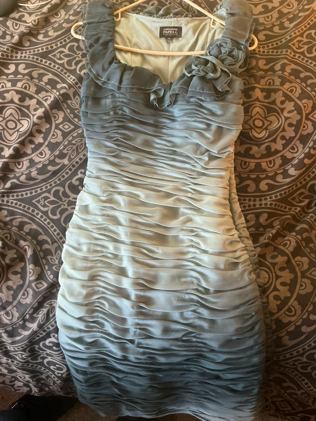 Selling a beautiful Adrianna Papell dress in an ombre blue color. It's a size 6 and in great condition! The dress features a unique ruched design and a lovely flower detail on the shoulder. Perfect for a special occasion!
